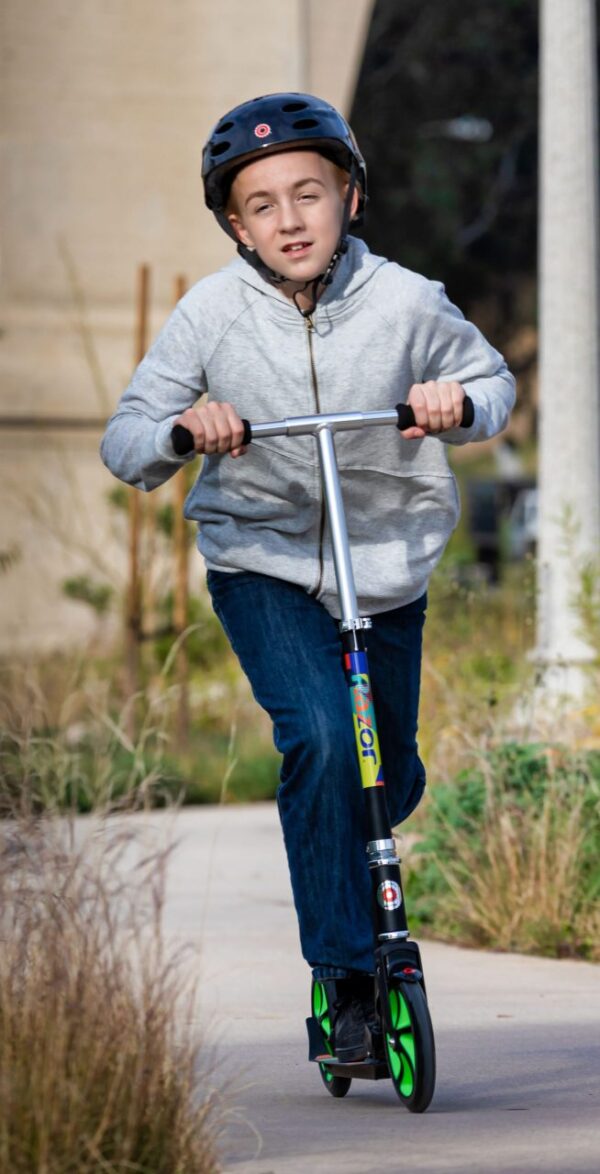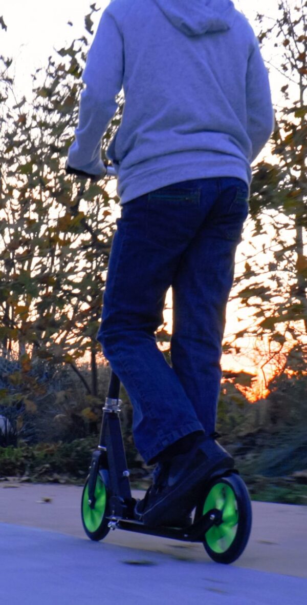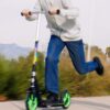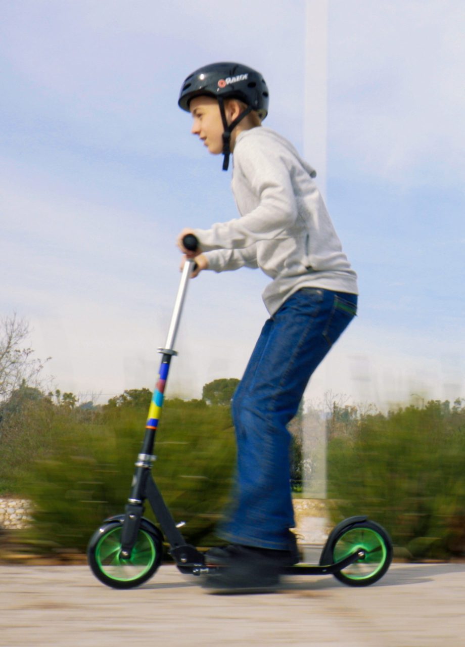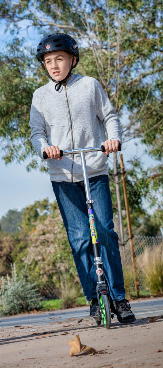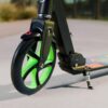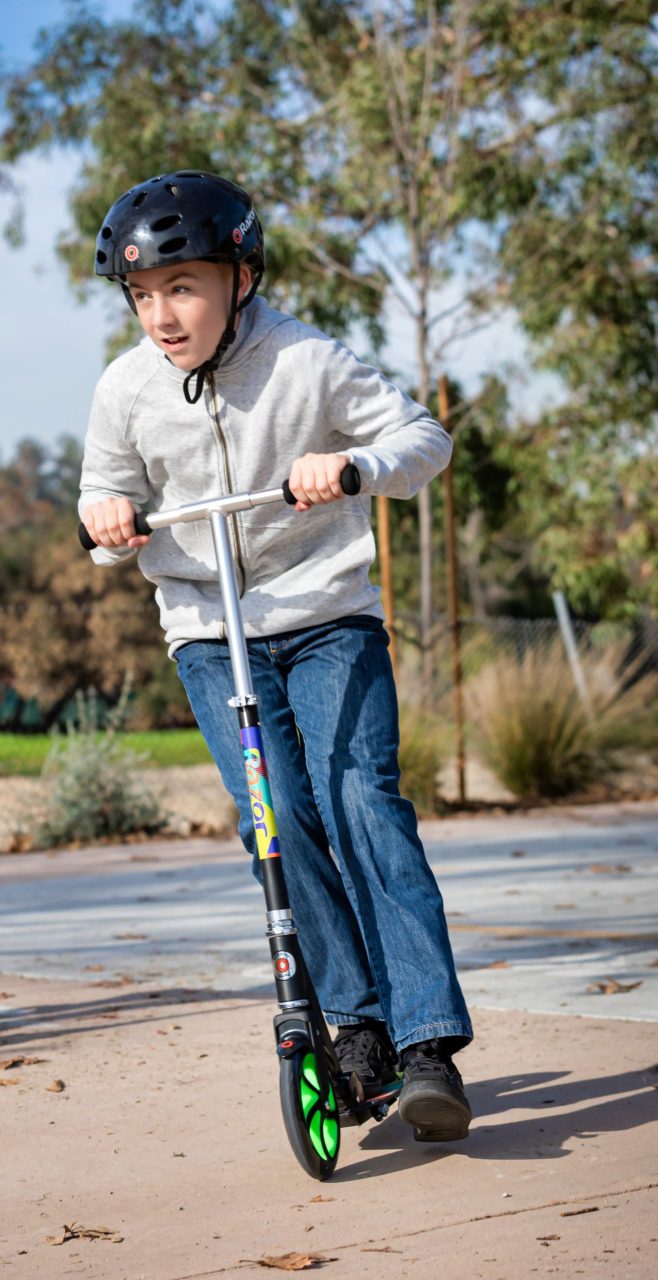 Combine a smooth ride with eye-catching style using the Razor A5 Lux Lighted scooter, presented in a vibrant green. Building upon the popular A5 Lux platform known for its extra-large 200mm wheels, this version adds motion-activated LED lights to the front wheel hub and steering tube for enhanced visibility and flair. Designed for riders aged 8 years up to adults, the large urethane wheels glide effortlessly over surfaces, providing a faster, more comfortable experience compared to smaller-wheeled scooters, especially beneficial on longer journeys.