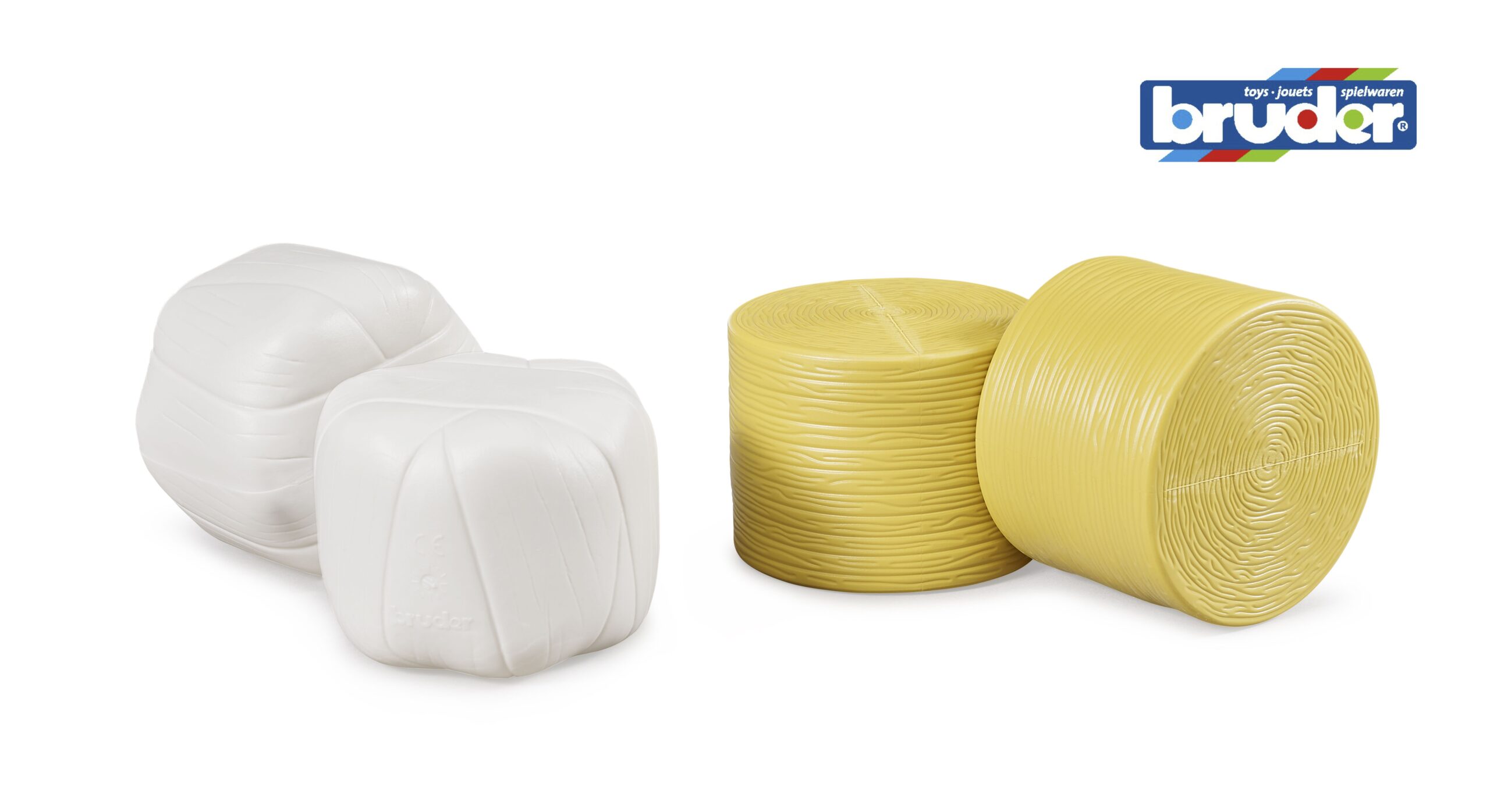 This set includes four round bales, comprising two white wrapped silage bales and two ochre-coloured hay bales, allowing children to recreate a wider range of realistic farm scenarios. The accurately scaled size and proportions make the bales ideal for loading, stacking, transporting, and feeding using compatible Bruder balers, loaders, bale trailers, and bale handling accessories (sold separately). The contrasting colours clearly represent different bale types, adding visual realism and variety to play.
