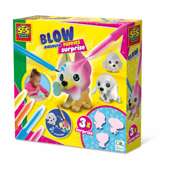 Discover which three adorable surprises are waiting for you inside this Blow Airbrush Puppies set from SES Creative. Hidden in the box are three cute puppies with soft, flock-coated fur, ready for a colourful and creative makeover. This unique kit allows children to decorate their new pets with vibrant, airbrushed designs.