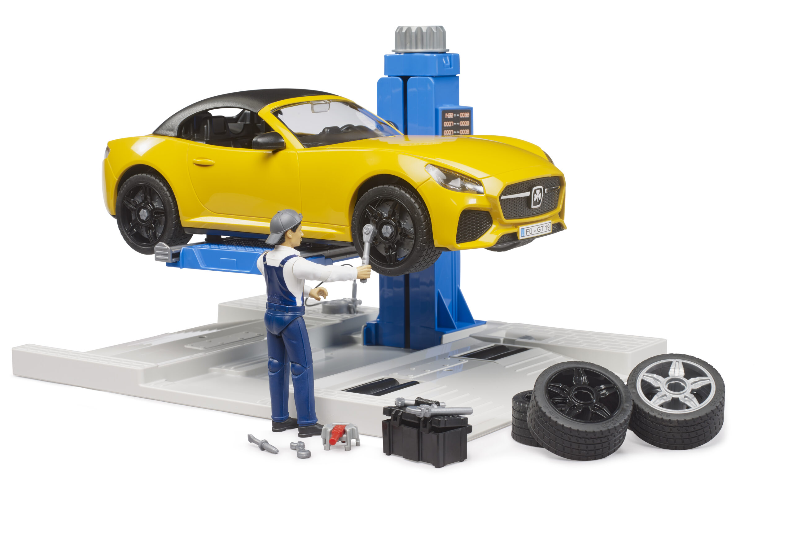 Young mechanics can run their own garage with this fully equipped service station. The bworld car service centre features a height-adjustable vehicle lift with brake tests, allowing the included mechanic figure to inspect the undercarriage and perform repairs on the sporty yellow roadster. The set comes complete with a comprehensive selection of tools, including a tyre pressure gauge and a transportable tool chest, ensuring every job is done to a professional standard.