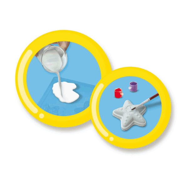 • Contents: Plaster mix, reusable mould, 6 paint colours, silver glitter, paintbrush, ring bases, brooch pins, necklace cords, instructions.