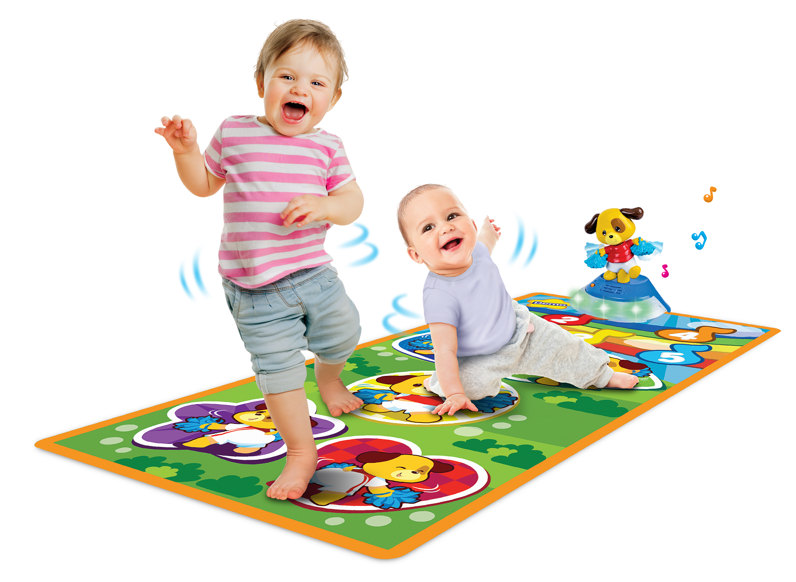 Features: Touch-sensitive mat, Dancing puppy figure, Lights, Sounds, Music