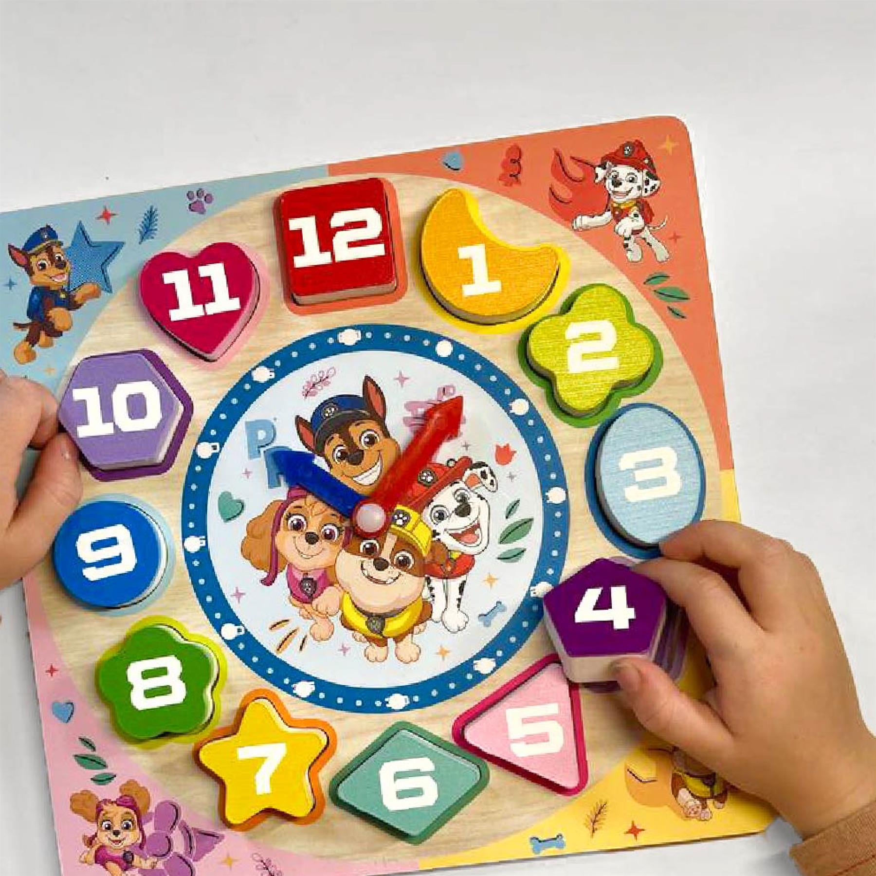 Make learning to tell the time a fun adventure with the Dodo Paw Patrol Wooden Learning Clock Puzzle! This engaging wooden toy features favourite pups like Chase, Skye, and Marshall right on the clock face. Designed for preschoolers aged three and up, it combines multiple learning activities: children can practice number recognition and shape sorting by fitting the colourful numbered blocks into their corresponding slots around the clock.