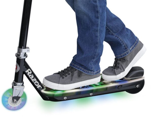 Illuminate your ride with the electrifying fun of the Razor Electric Tekno Scooter. Designed for riders aged 8 and up, this scooter brings a vibrant blue LED light show to the deck, pulsing with light as soon as the throttle is engaged. Powered by Razor’s innovative Power Core™ hub motor technology, it delivers a smooth, quiet, and maintenance-free ride, eliminating the need for chains or alignment. The efficient hub motor allows the scooter to reach speeds of up to 10 mph (16 km/h), providing thrilling yet manageable performance for young riders exploring their surroundings. Enjoy extended fun with a continuous run time of approximately 30 minutes per battery charge.
