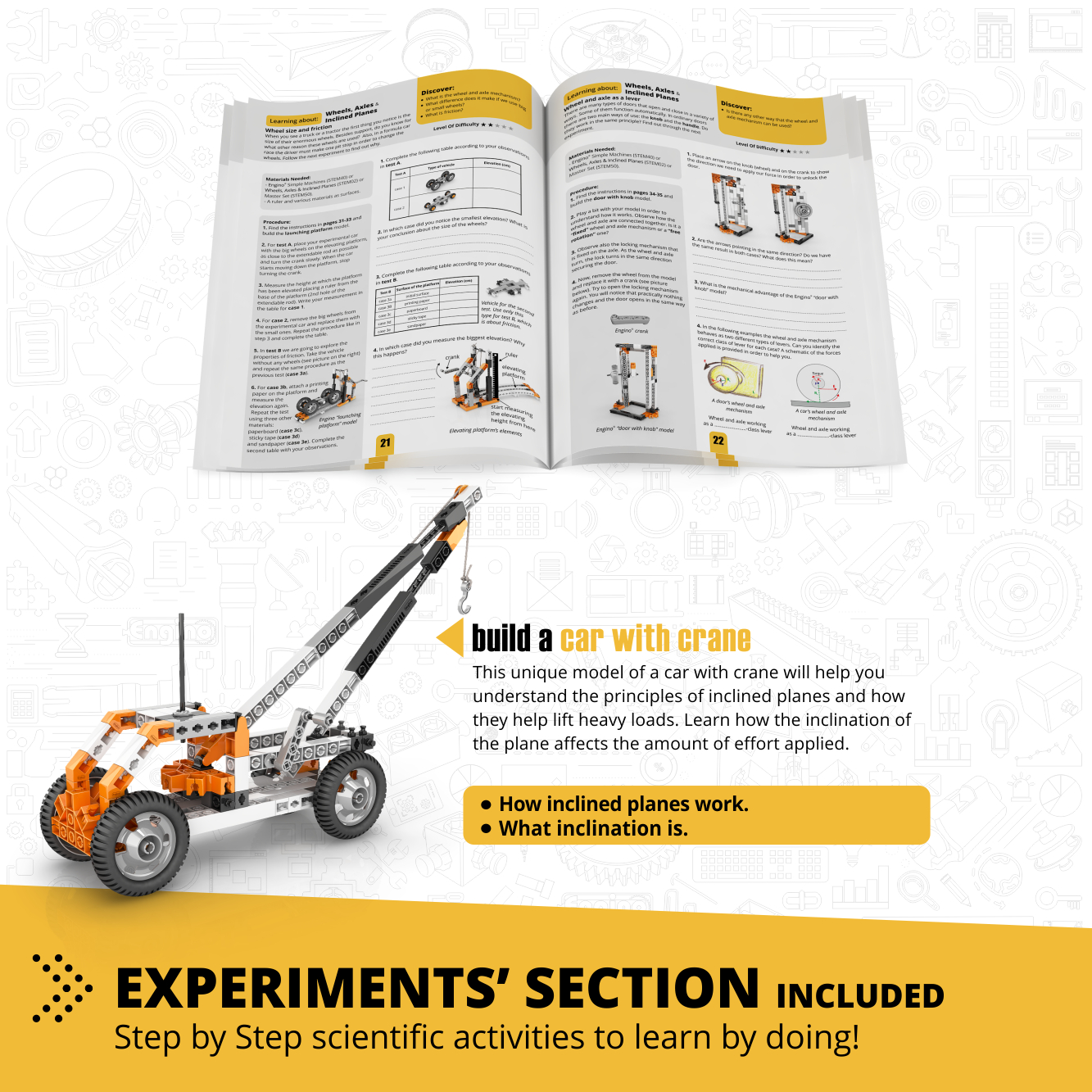 The Engino Wheels Axles Kit allows for practical investigation into concepts like reducing friction, gaining mechanical advantage, and how inclined planes lessen the force needed to lift objects. A comprehensive booklet provides clear building instructions for numerous models and explains the relevant scientific principles in detail. The Engino Discovering STEM: Mechanics – Wheels, Axles & Inclined Planes kit develops problem-solving skills, mechanical intuition, and an understanding of essential physics concepts. Roll into discovery with this informative Engino Wheels Axles Kit.