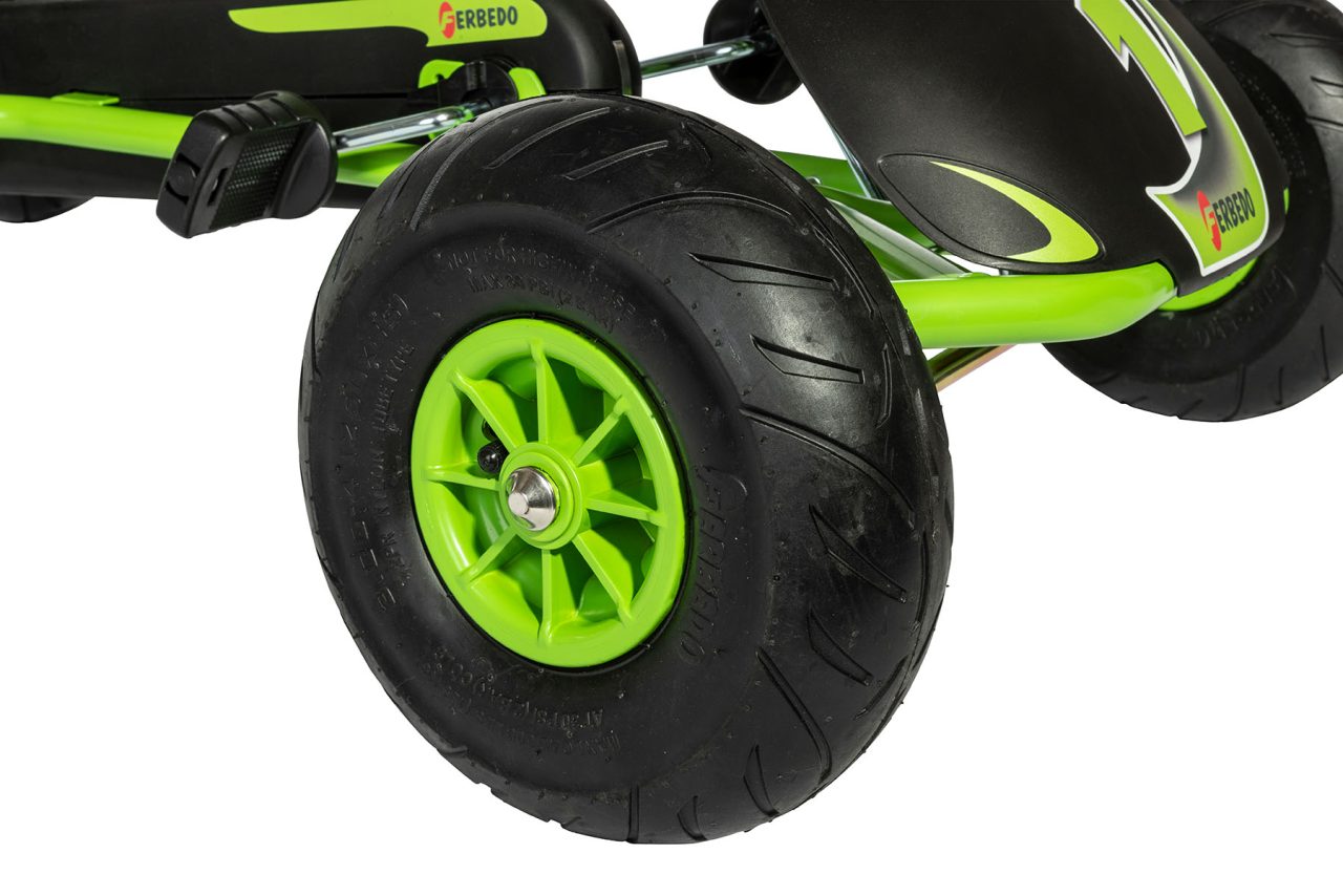 Enjoy thrilling outdoor adventures with the vibrant Ferbedo Go-Kart AR 8G! This high-quality pedal go-kart features a sporty black and striking green design, built on a robust steel frame for lasting performance. Ideal for young racers aged approximately 5 to 11 years, the AR 8G is equipped with large pneumatic air tyres that ensure a comfortable ride and excellent traction on various terrains, including paths and grass. The Ferbedo AR 8G Go-Kart prioritises comfort with its ergonomically designed seat, which can be adjusted to accommodate growing drivers. It features the convenient Ferbedo AR automatic freewheel system, enabling effortless coasting without the pedals spinning and simple switching between forward and reverse. For reliable stopping power, an easy-to-operate handbrake acts on both rear wheels.