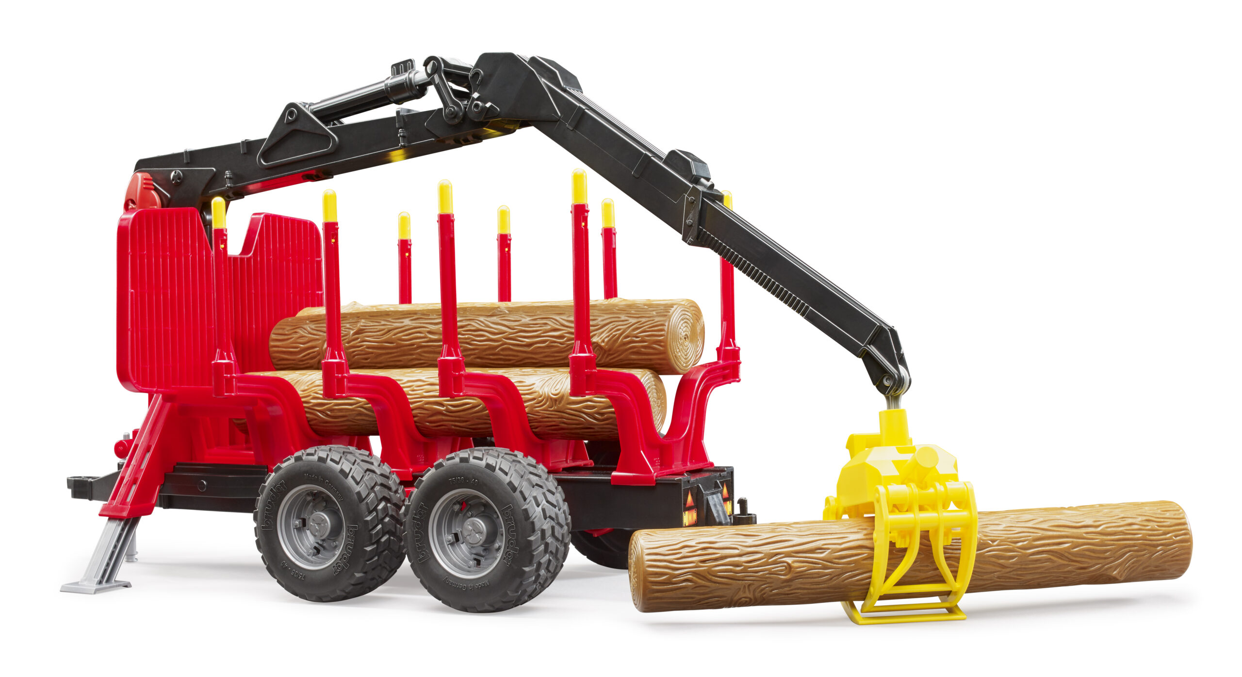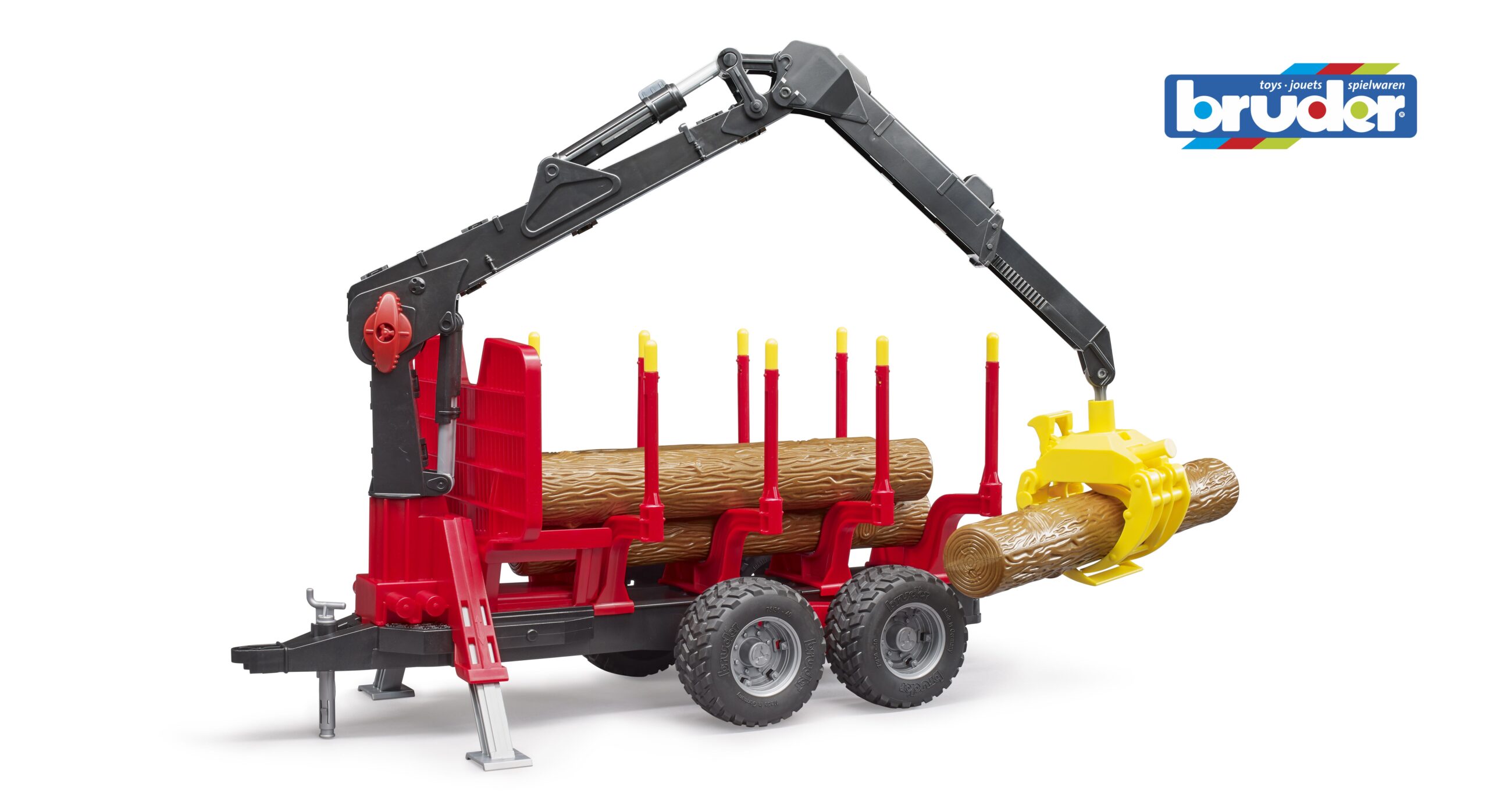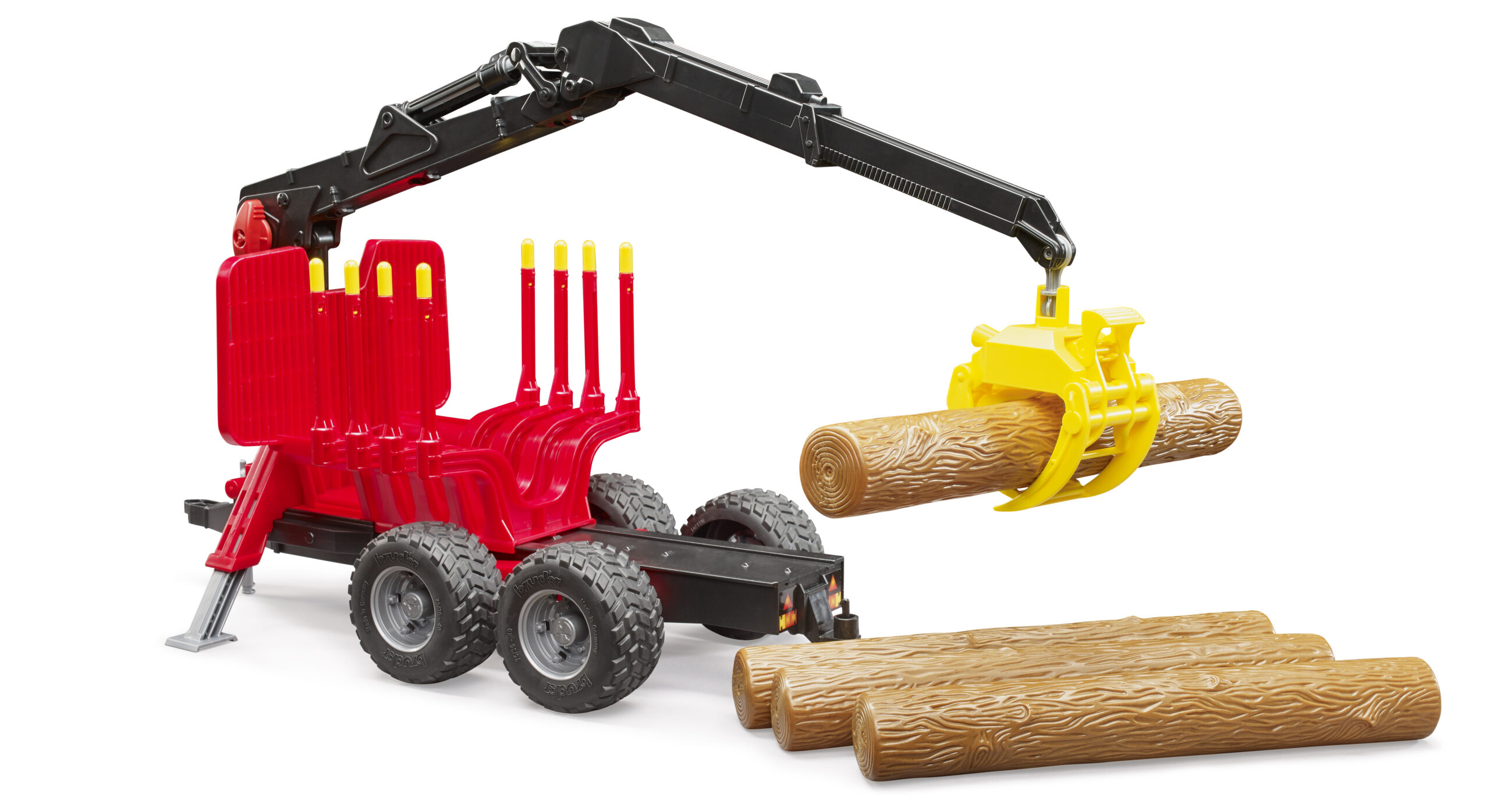 To ensure safe operation on uneven forest terrain, the trailer is equipped with an oscillating axle and rugged tread tyres. Extendable stabiliser legs drop down to keep the forestry trailer steady during lifting tasks. With four realistic tree trunks included in the set, the logging fun can begin immediately.