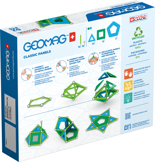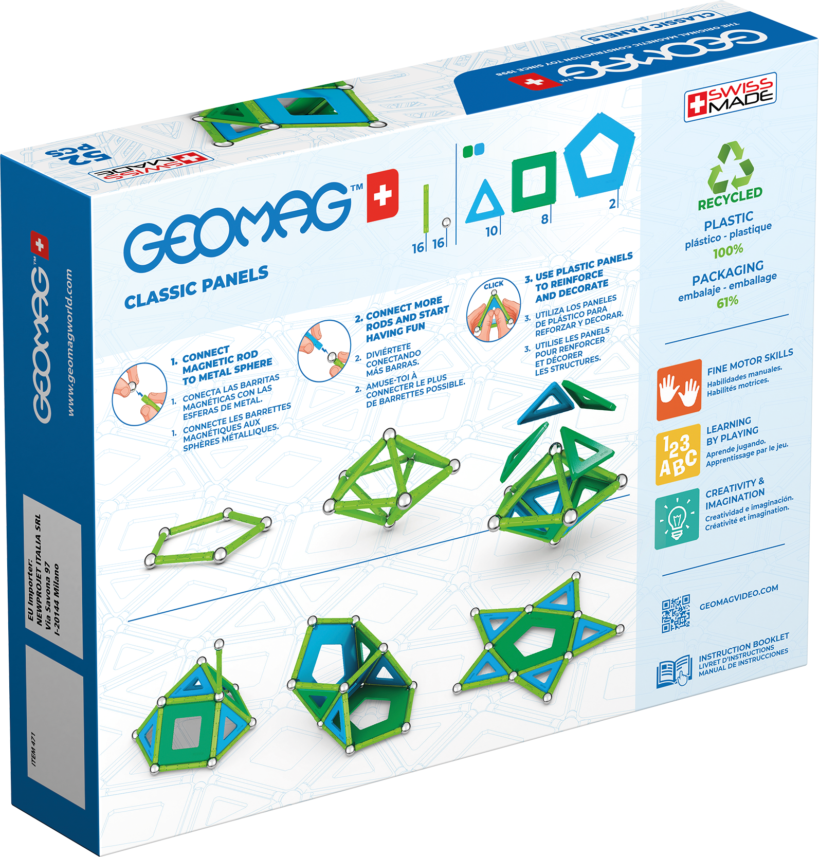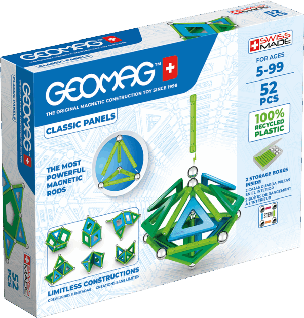 Discover the joy of magnetic construction with the Geomag Classic Panels Recycled 52 Pieces Set. This versatile kit includes powerful magnetic rods, steel spheres, and sturdy panel pieces in classic green and blue, perfect for building a wide array of 2D and 3D structures. Made from 100% recycled plastic, this set offers an environmentally friendly way to play and learn. The Geomag Classic Panels Recycled 52 Pieces Set is designed to stimulate creativity, develop spatial awareness, and introduce basic principles of magnetism and geometry, providing endless hours of engaging fun.
