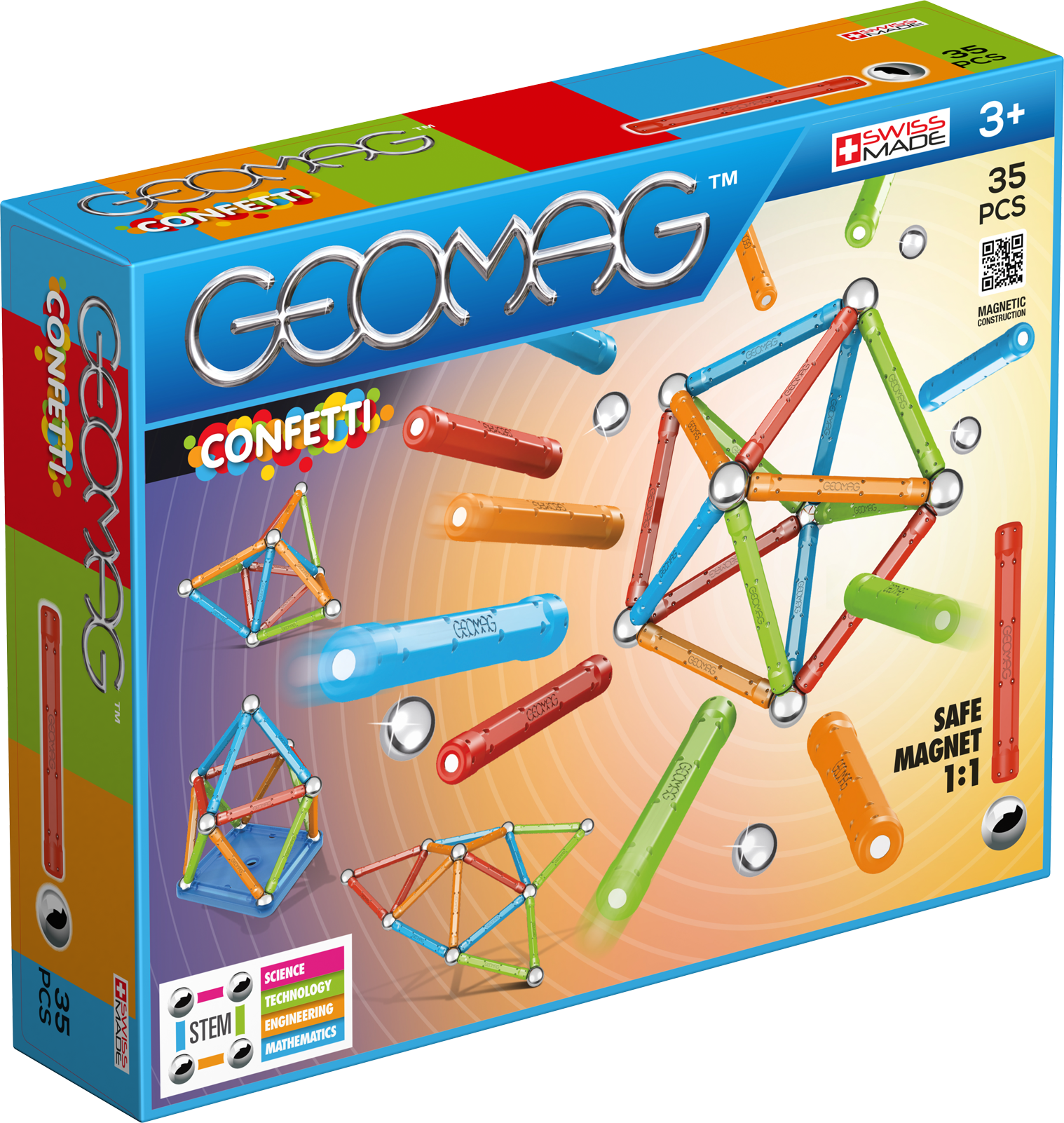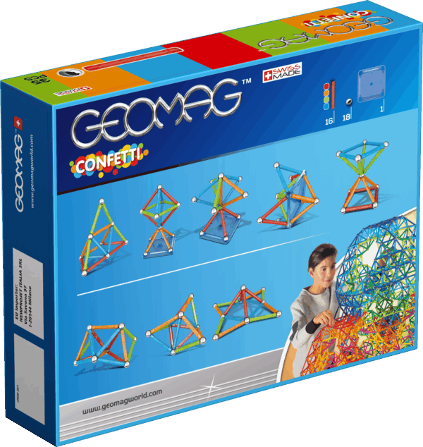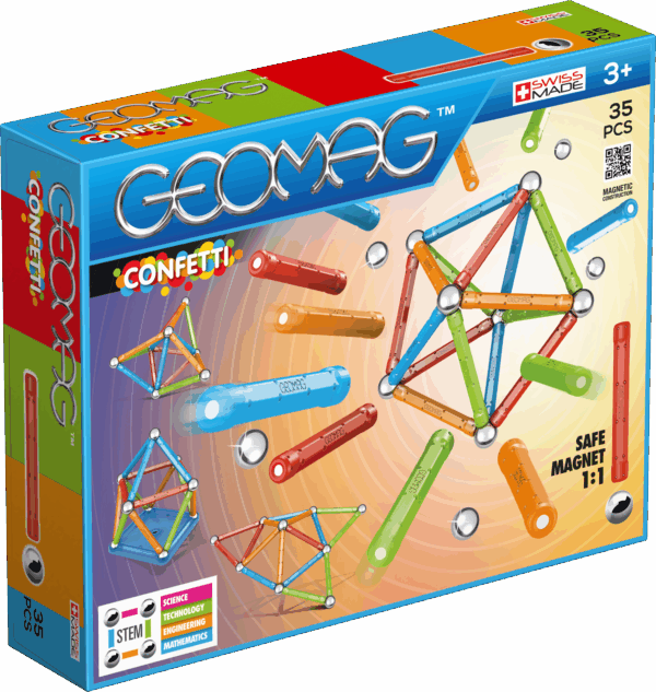 Spark creativity with a burst of colour using the Geomag Confetti 35 Pieces Set. This vibrant kit features powerful magnetic rods in an array of bright, cheerful “confetti” colours and non-magnetic steel spheres, perfect for building a multitude of imaginative 2D and 3D structures. Designed to be safe and engaging, it utilises a 1:1 safe magnet system. The Geomag Confetti 35 Pieces Set is an excellent way for young children to explore the basics of magnetism, geometry, and creative construction, encouraging hands-on learning and fine motor skill development.