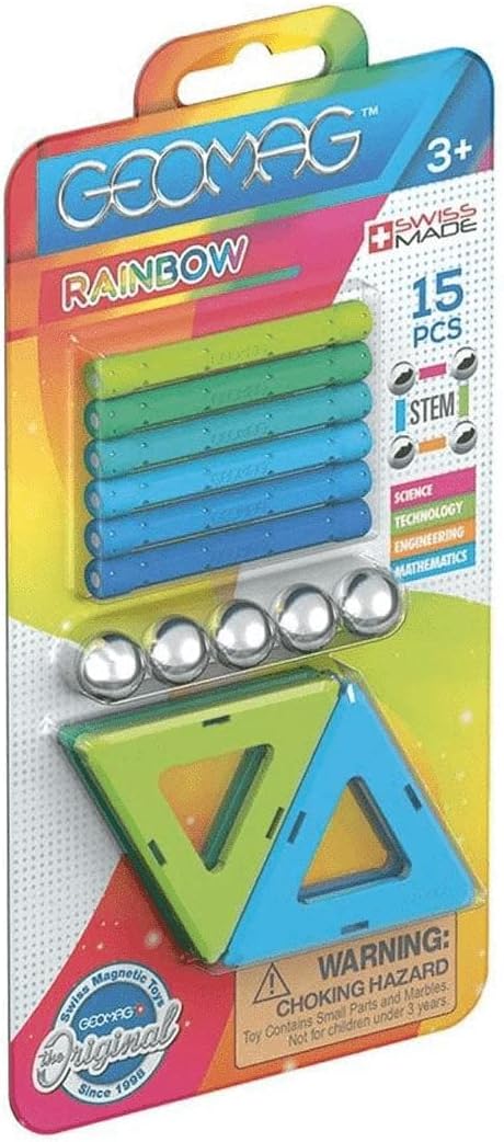 Experience a burst of colourful creativity with the Geomag Rainbow Panels 15 Pieces Blister Pack. This compact set includes powerful magnetic rods, steel spheres, and vibrant triangular panel pieces in brilliant rainbow hues, perfect for creating small but striking 2D and 3D models. Ideal as an introductory set, party favour, or for on-the-go fun, it introduces the basic principles of magnetism and geometric construction. The Geomag Rainbow Panels 15 Pieces Blister Pack offers a taste of Swiss-made quality and engaging STEM learning for young builders.
