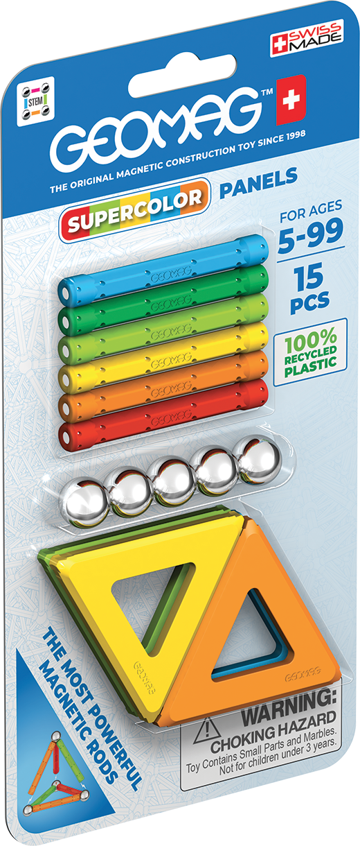 Experience the vibrant fun of magnetic construction with the Geomag Supercolor Panels 15 Pieces Set. This compact kit includes powerful magnetic rods, steel spheres, and colourful triangular panel pieces, allowing for the creation of small but striking 2D and 3D models. Ideal as a taster set or for on-the-go creativity, it introduces the core principles of magnetism and geometric building. The Geomag Supercolor Panels 15 Pieces Set is crafted from durable materials, including 100% recycled plastic for the main components, offering a great way to explore STEM concepts through hands-on play.