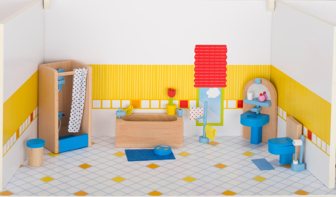 Kit out the doll’s house with the Goki Doll’s House Furniture – Bathroom set. This comprehensive wooden collection has everything a doll family needs to get ready for the day. The set includes a corner shower with a polka-dot curtain, a bathtub, a toilet, and a sink with a mirror. With lovely details like blue fixtures and matching bath mats, this set encourages imaginative role-play based on everyday routines.