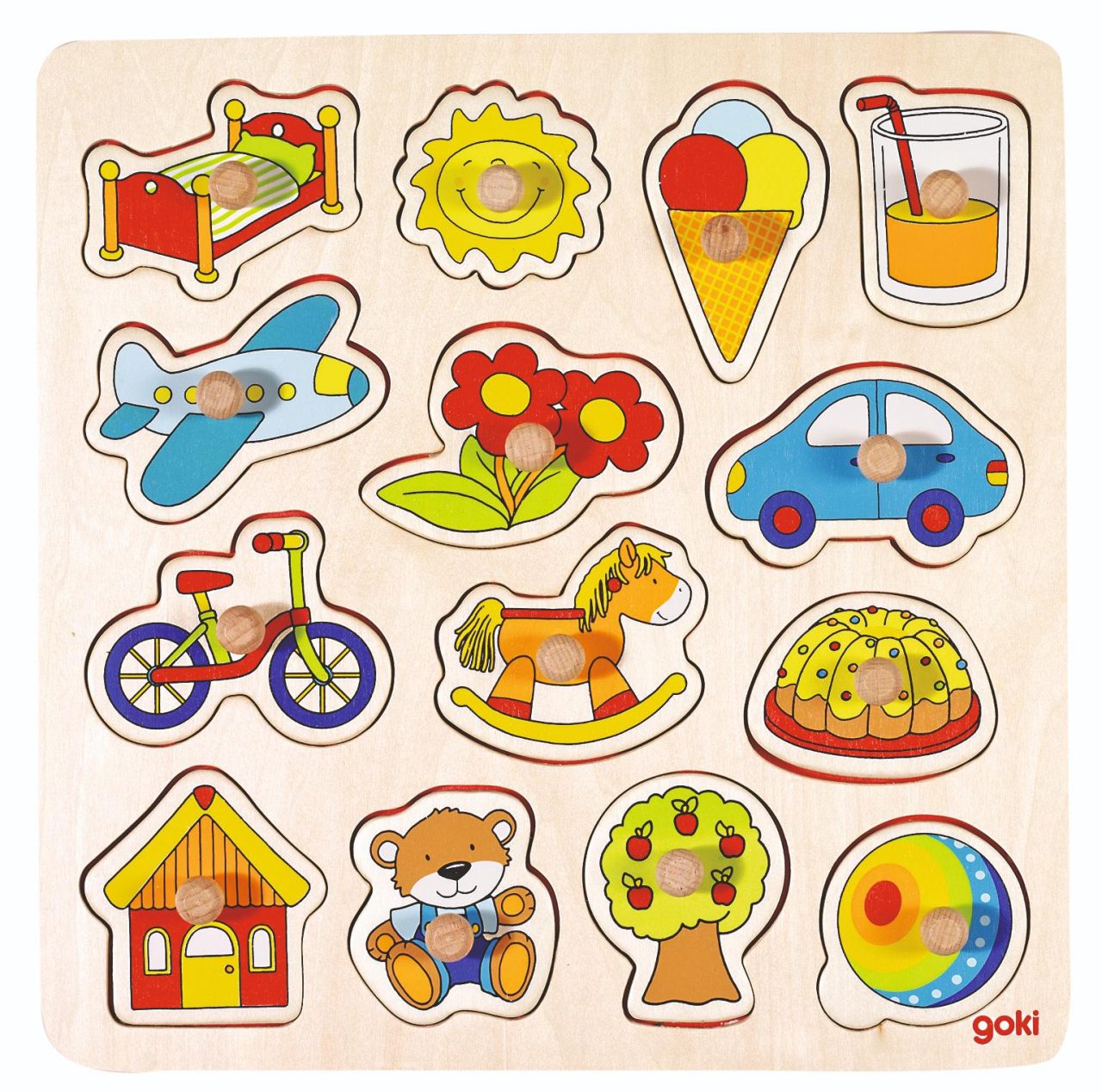 Familiarise your child with the world around them with the Goki Lift-out Puzzle – Everyday Objects. This busy wooden puzzle is packed with 14 recognisable items from a child’s daily life, including a bed, a car, a teddy bear, an ice cream cone, and a rocking horse. Each colourful piece is fitted with a large wooden knob. It’s simple and easy for toddlers to grip, explore, and match to the correct space on the board. The Goki Lift-out Puzzle – Everyday Objects is a fantastic tool for vocabulary building and developing hand-eye coordination.