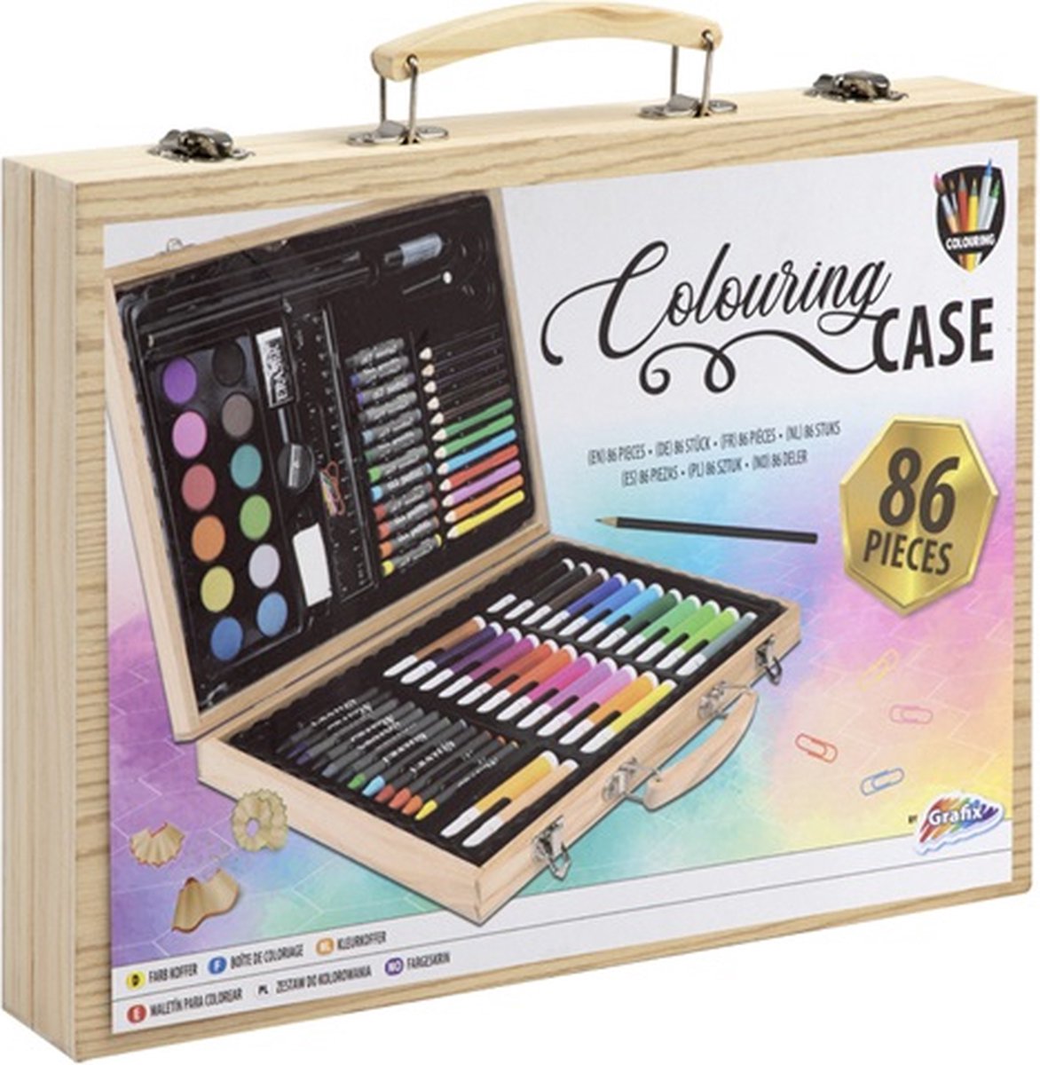 Unlock a world of creativity with the Grafix Wooden Artist Case. This beautiful FSC-certified wood case opens up to reveal a complete 86-piece art studio, with a huge variety of materials for any budding artist to explore. Neatly organized inside, you’ll find everything from vibrant oil pastels and crayons to colouring pencils, felt-tip pens, and a watercolour paint palette. The Grafix Wooden Artist Case is the perfect all-in-one set for drawing, painting, and colouring, and its sturdy carry handle makes it easy to take inspiration with you wherever you go.