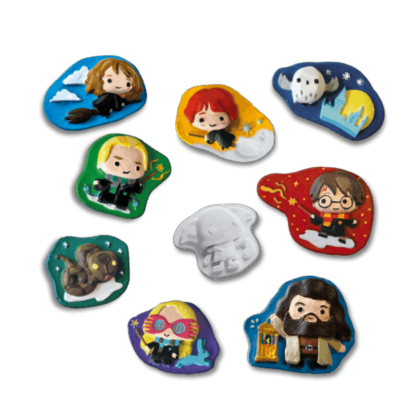 Mix the safe plaster powder with water and pour it into the detailed mould. It features Harry Potter, Hermione Granger, Ron Weasley, Draco Malfoy, Hagrid, Hedwig, and Nagini. Once the plaster has set hard, you can carefully pop the figures out. The final step is to use the twelve included paint colours to decorate the characters and bring them to life with colour and detail.