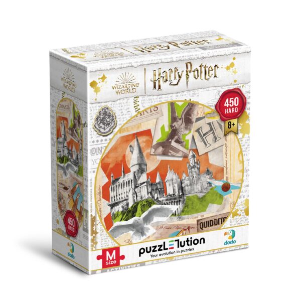 Return to the hallowed grounds of the most famous wizarding school with the Harry Potter Puzzle – Hogwarts School and Quidditch Field 450 Pieces. This captivating puzzle presents a beautiful collage showcasing the majestic Hogwarts Castle alongside the thrilling Quidditch Pitch, complete with goal posts. It evokes the magic, mystery, and excitement of school life, featuring imagery like the Sorting Hat, school letters, and hints of high-flying broomstick action.