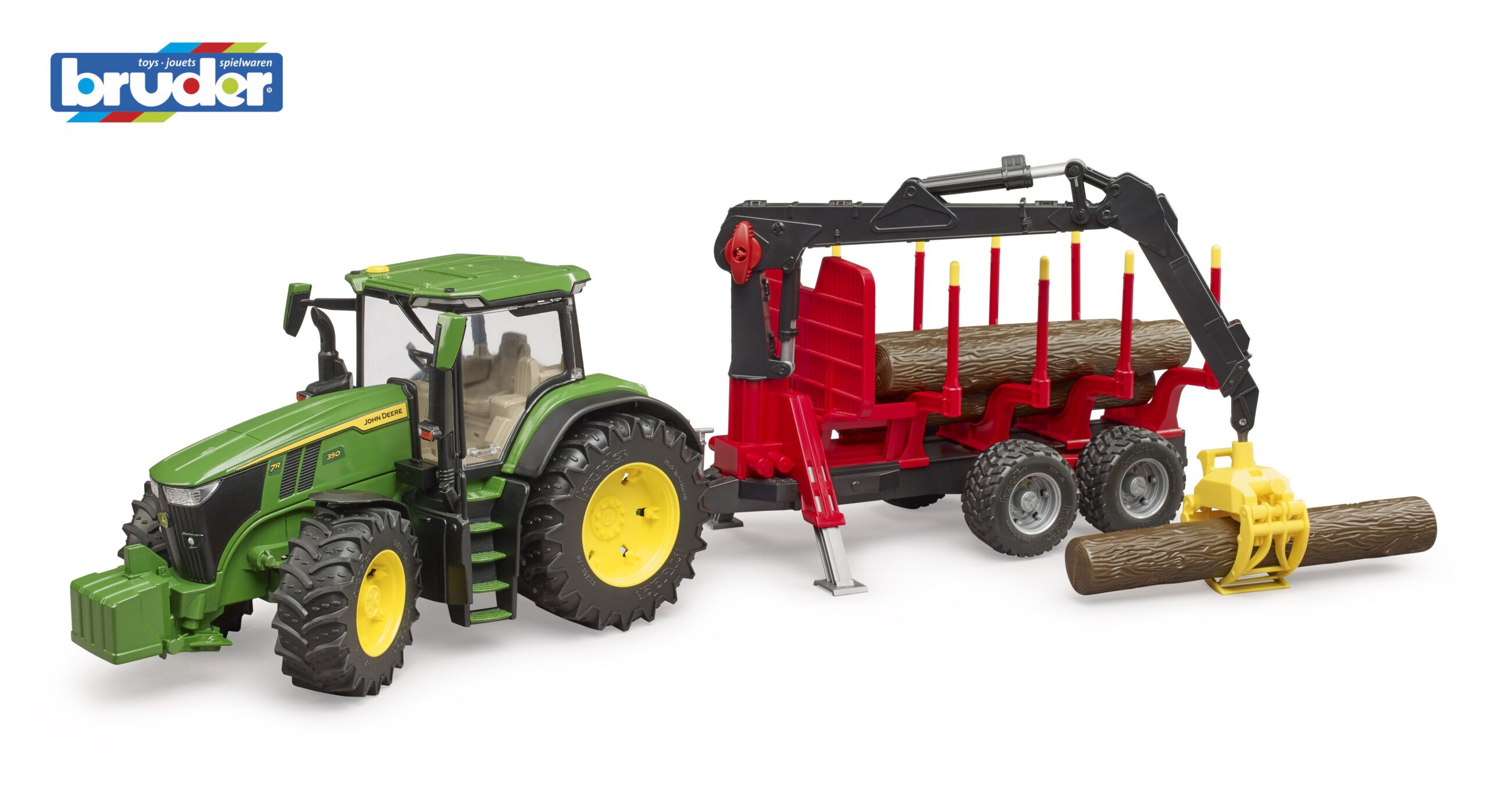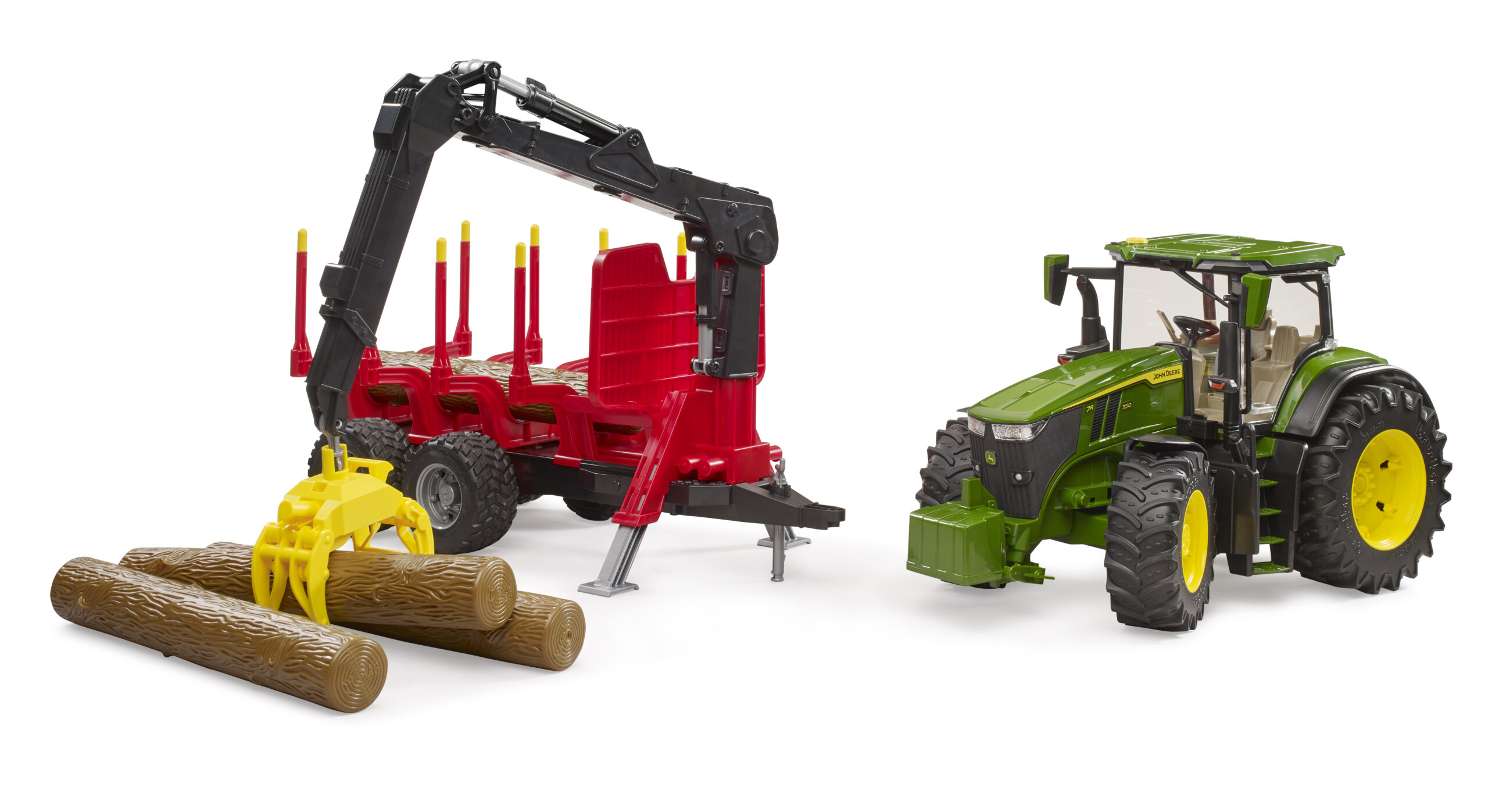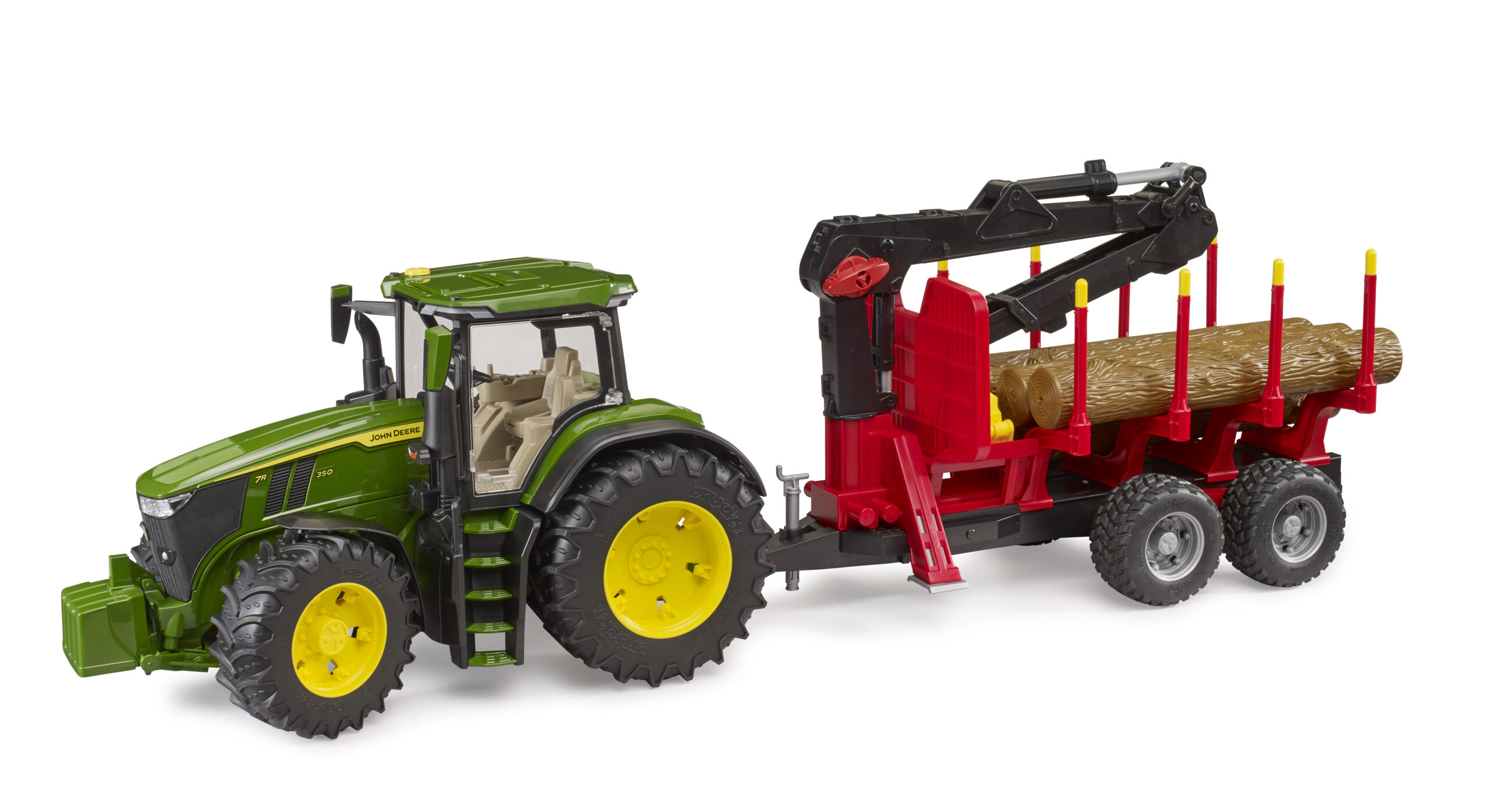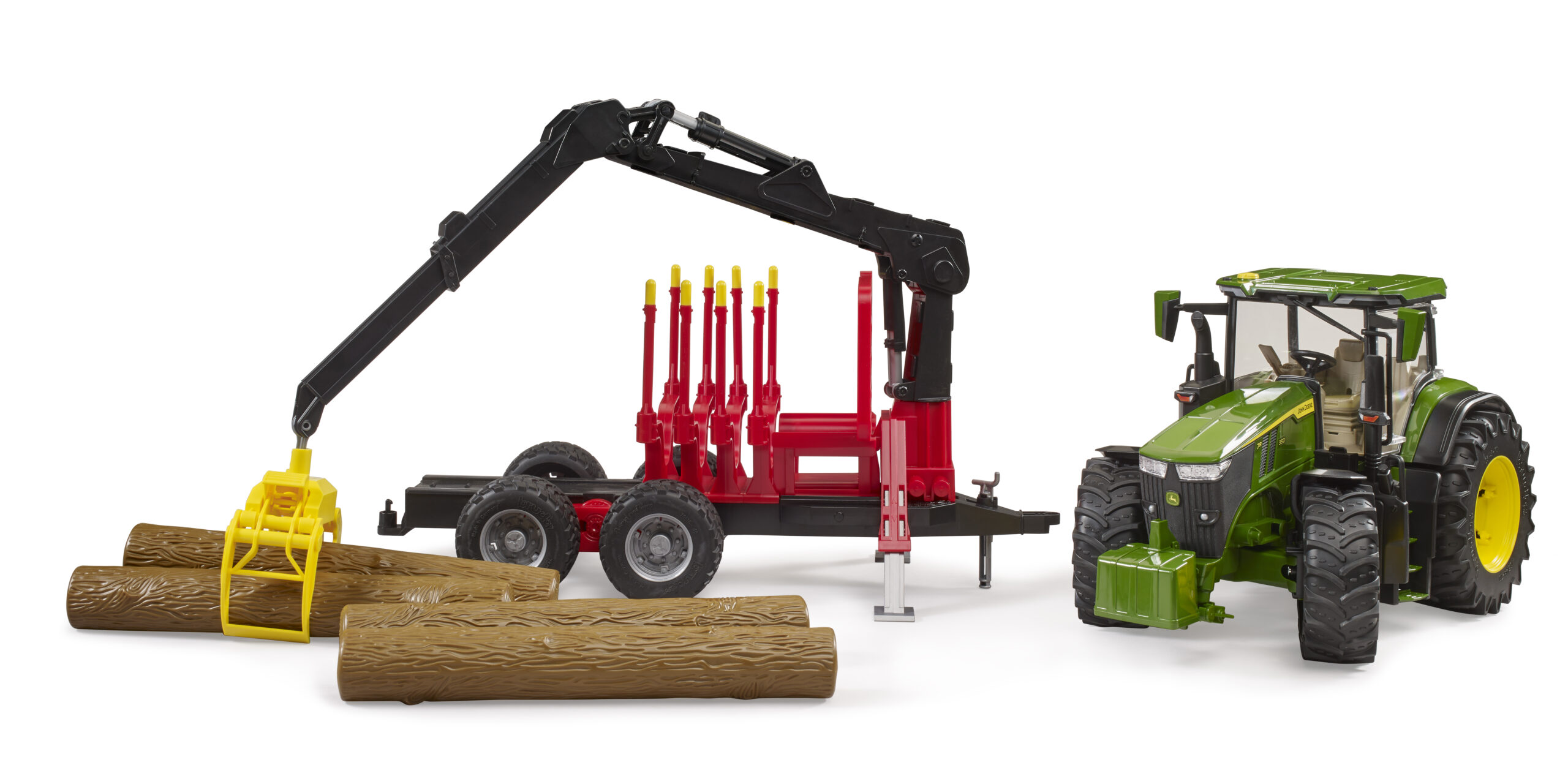 Forestry work is tough, but this robust machine makes it look easy. The John Deere forestry tractor is the ultimate tool for managing the woodland, featuring a powerful 7R 350 model paired with a specialised trailer. Young foresters can use the fully functional crane to grab and lift the four included tree trunks, stacking them neatly between the adjustable stanchions. The crane arm swivels 360 degrees, allowing for precise loading from any angle, while the trailer coupling ensures a secure connection over rough terrain. The steerable front axle, operated by the extension rod through the roof, gives children full control as they navigate the forest floor. Rugged tread tyres ensure excellent grip on carpet or garden soil.