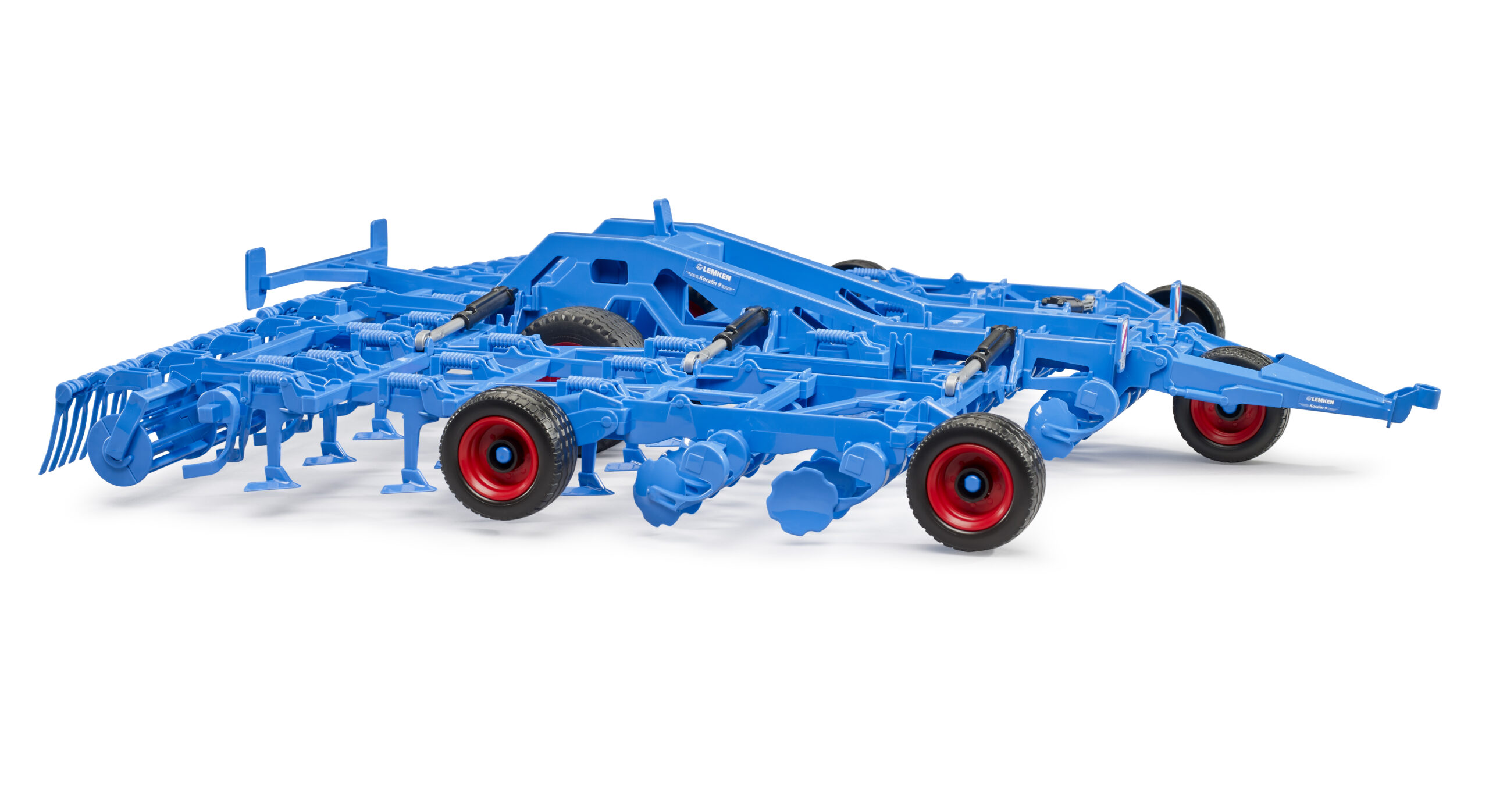 Once in the field, the unit unfolds to cover a wide working area, displaying its true scale. The trailing rollers rotate mechanically as the vehicle moves, smoothing the earth behind the tines. A lever on the chassis operates the switch from transport to work mode, engaging the running gear. Compatible with all Professional series tractors, this lemken cultivator koralin 9 is a robust addition to any collection, crafted from high-quality plastics for durable indoor and outdoor play.