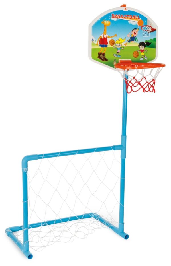Constructed from lightweight yet durable blue plastic tubing, the set is easy to assemble. At the top, a colourful backboard supports an orange hoop with a net, perfectly sized for young players learning to shoot baskets. Below, the frame forms a compact football goal complete with its own net, ready for practising those winning kicks. This dual-activity set promotes throwing, kicking, and aiming skills while fostering a love for sports. The Pilsan Magic Basketball & Football Set often comes with a ball included to get the games started right away.