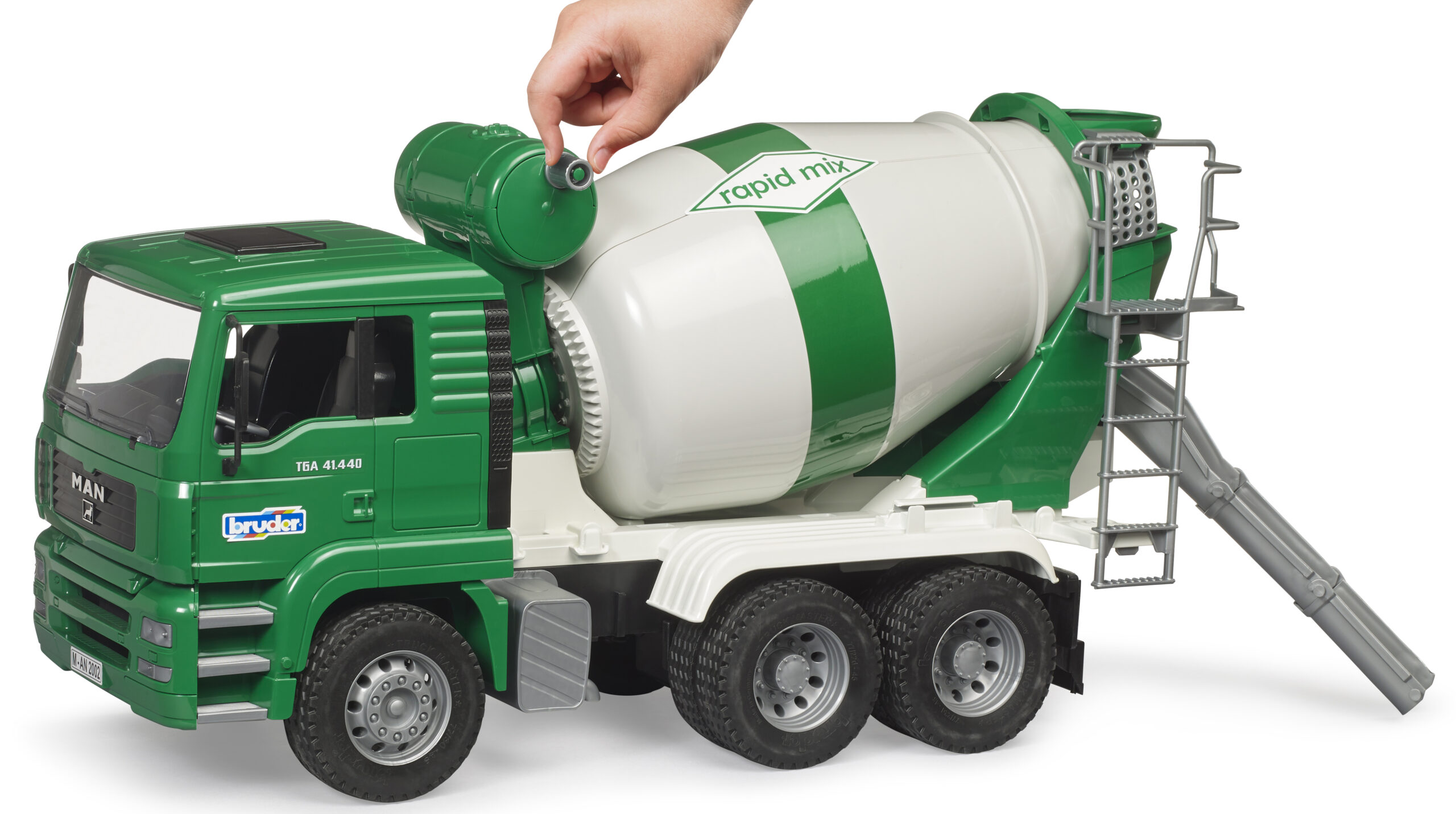 To discharge the load, the direction of rotation is simply reversed, and the internal spiral conveyor pushes the contents out through the rear chute. The chute assembly can be lengthened with the included slide-on sections to reach the exact spot. With a tilting driver’s cab that reveals the engine block and rugged tread tyres for stability, this man tga cement mixer offers a robust and educational play experience for indoor and outdoor projects.