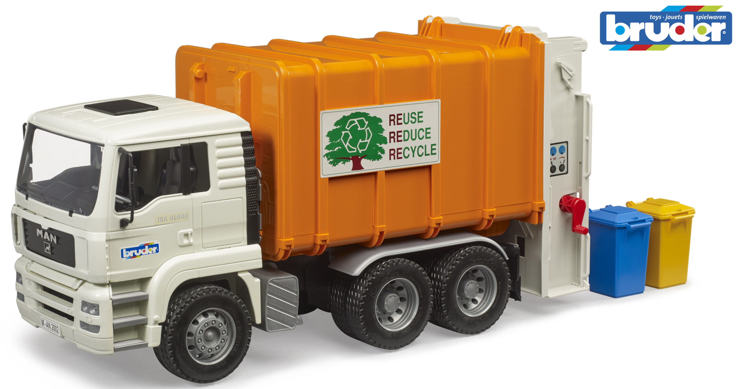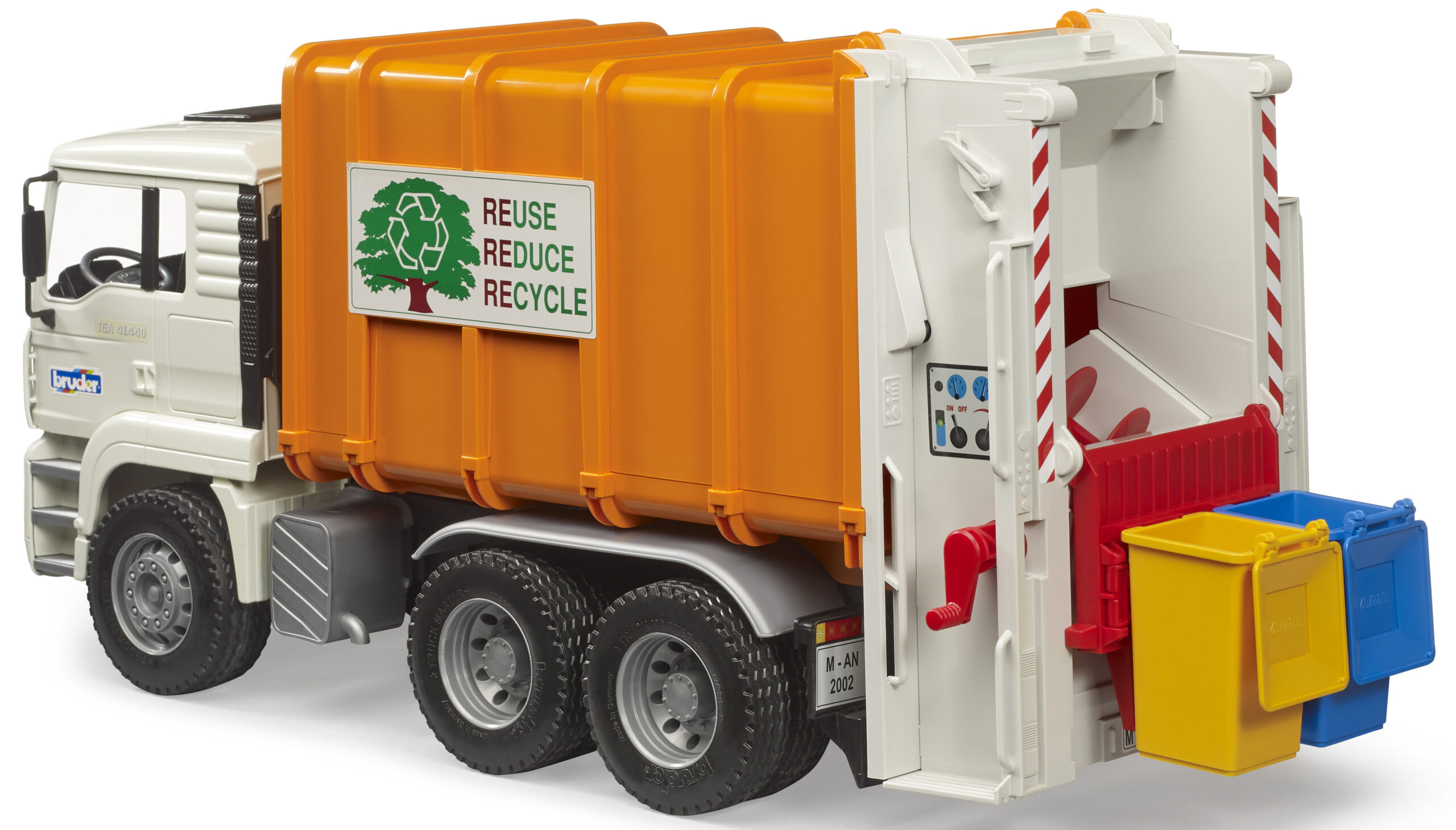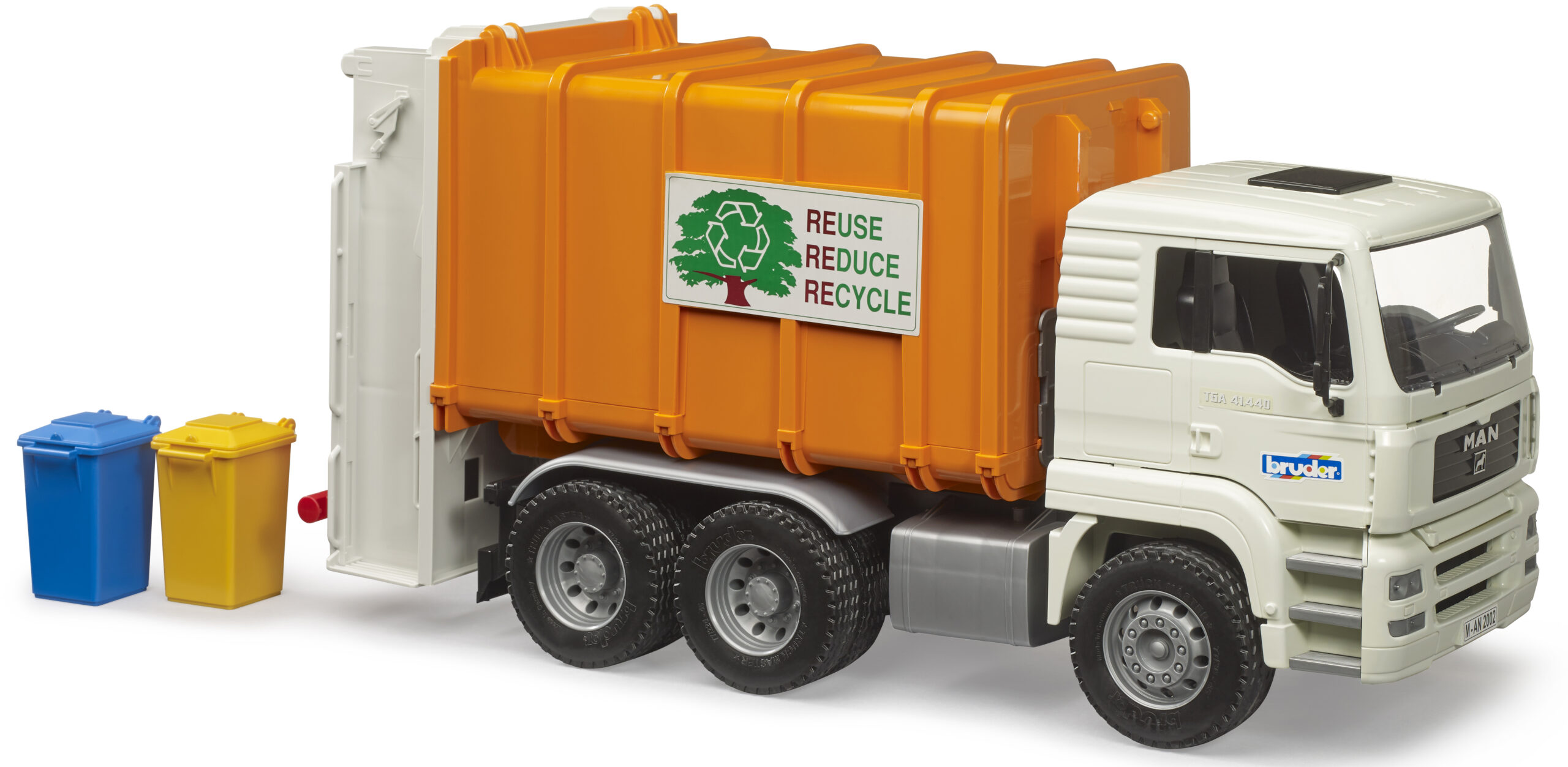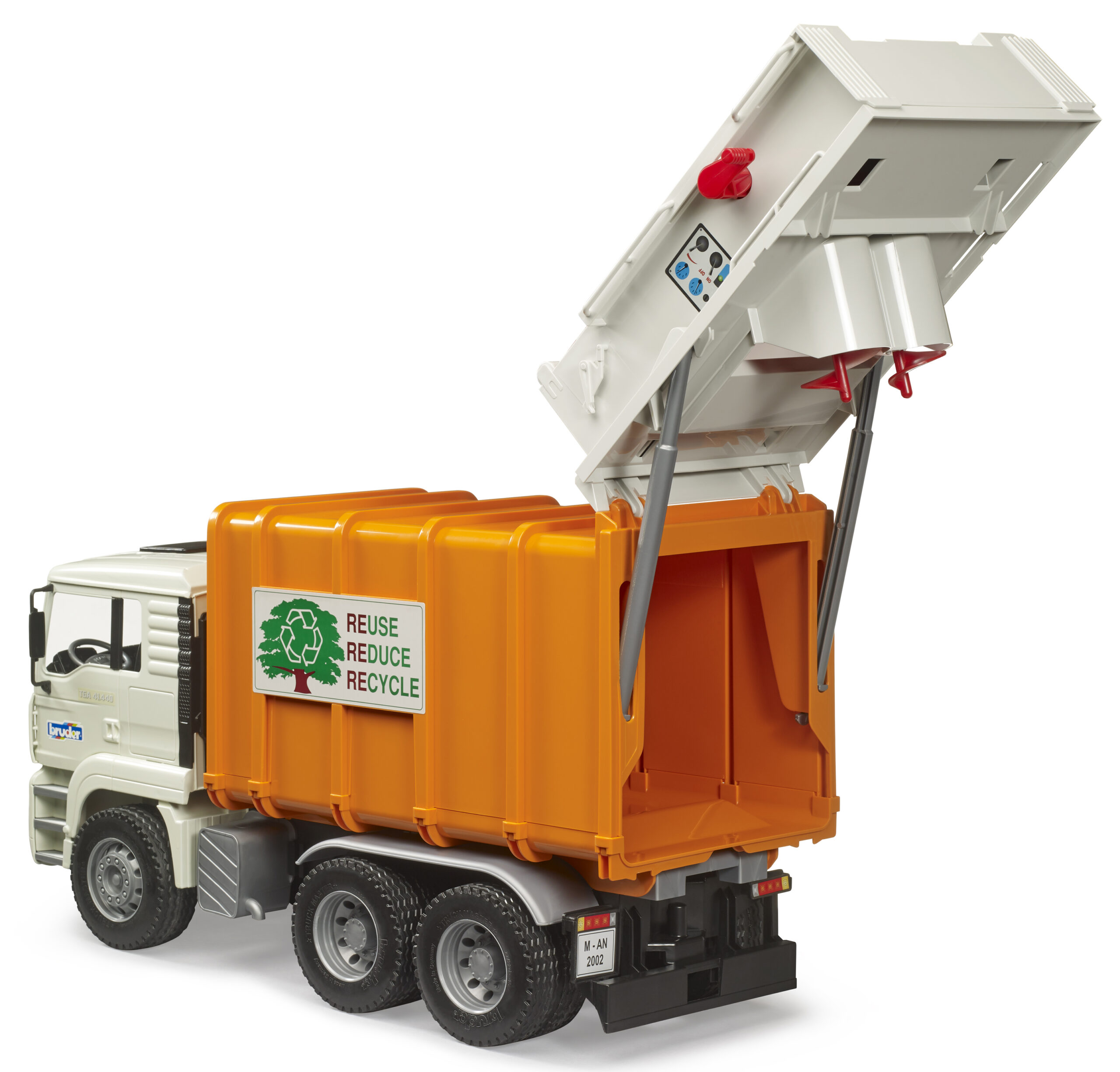 Once the refuse is inside, the rotating conveying system transports the waste into the main container, allowing for plenty of loading fun. Built from high-quality, durable plastics, this man tga garbage truck is perfect for teaching children about recycling and community services through engaging, hands-on role-play in the playroom or garden.