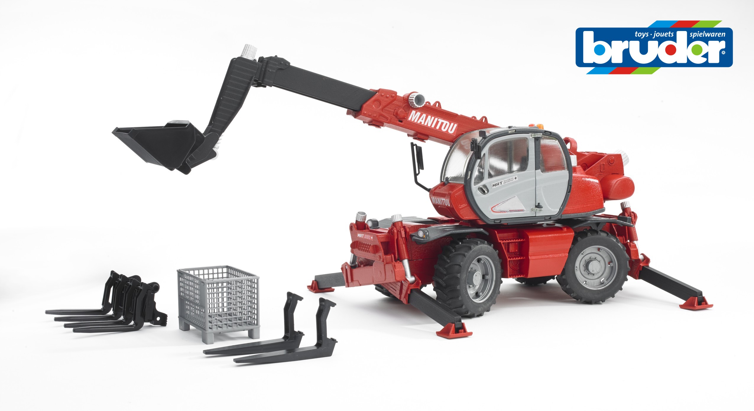 Construction sites and farms need versatile equipment, and this red machine is the perfect solution for heavy lifting. The manitou telescopic forklift features a cab and boom assembly that rotates a full 360 degrees, allowing young operators to distribute materials in any direction without moving the chassis. To handle the heaviest loads safely, four telescopic stabiliser legs can be deployed to anchor the vehicle firmly to the ground, just like the real MRT 2150 found on building projects worldwide.