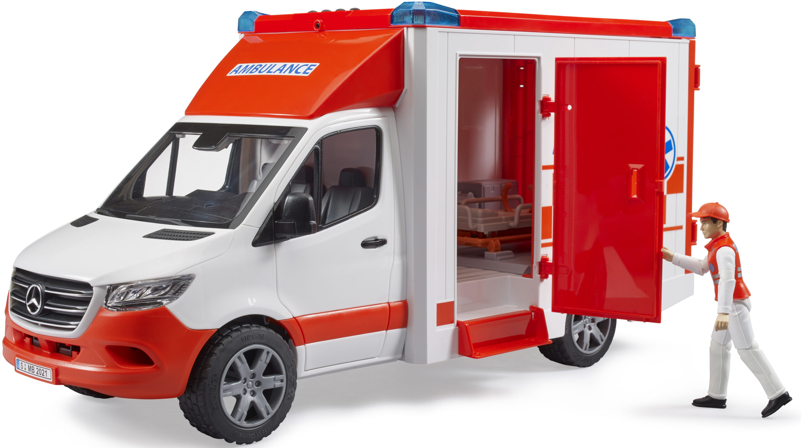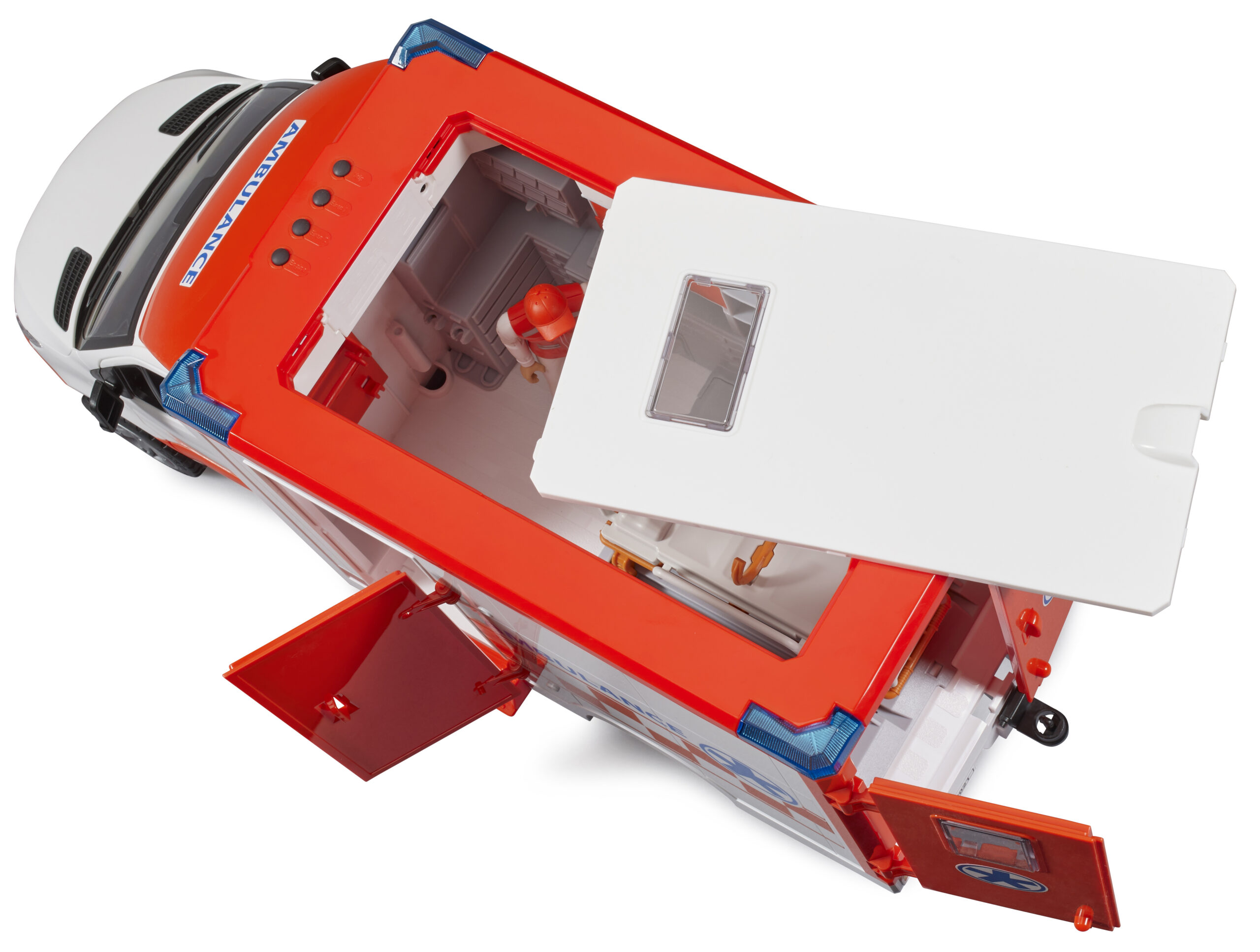 When every second counts, this emergency vehicle is ready to race to the scene. The mb sprinter ambulance is a fully equipped mobile hospital, featuring a height-adjustable stretcher that can be pulled out and pushed back in, just like the real thing. The set includes a uniformed paramedic figure who can access the treatment area through the side door or the wide-opening rear barn doors to tend to patients.