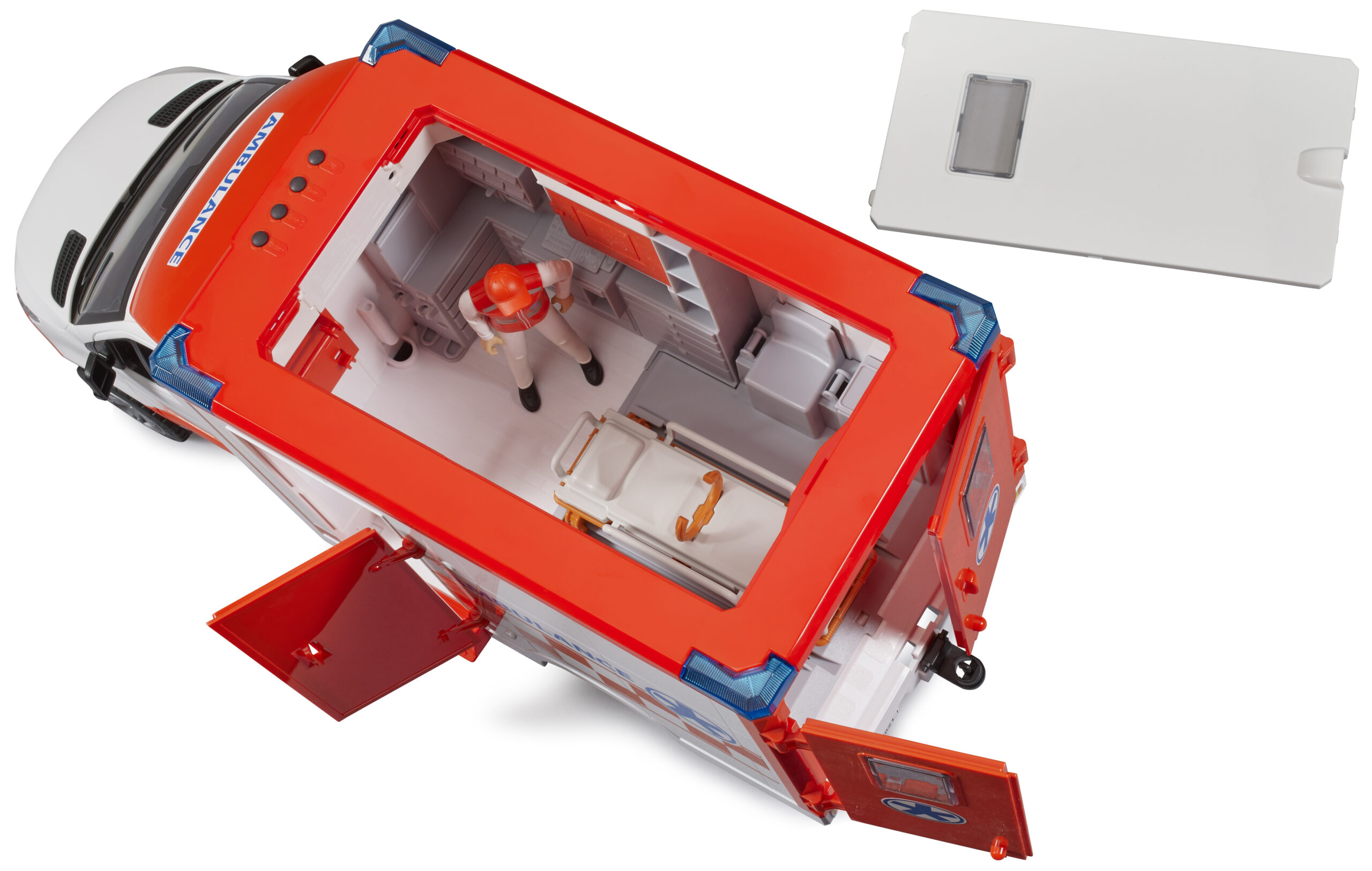 To clear the way through busy traffic, the ambulance boasts a functional Light & Sound module with multiple siren options. The driver’s cab doors open to allow the paramedic to jump behind the wheel, while the removable roof section gives children easy access to the detailed interior for better play. This mb sprinter ambulance offers a comprehensive rescue experience, helping children learn about emergency services and develop empathy through caring role-play.