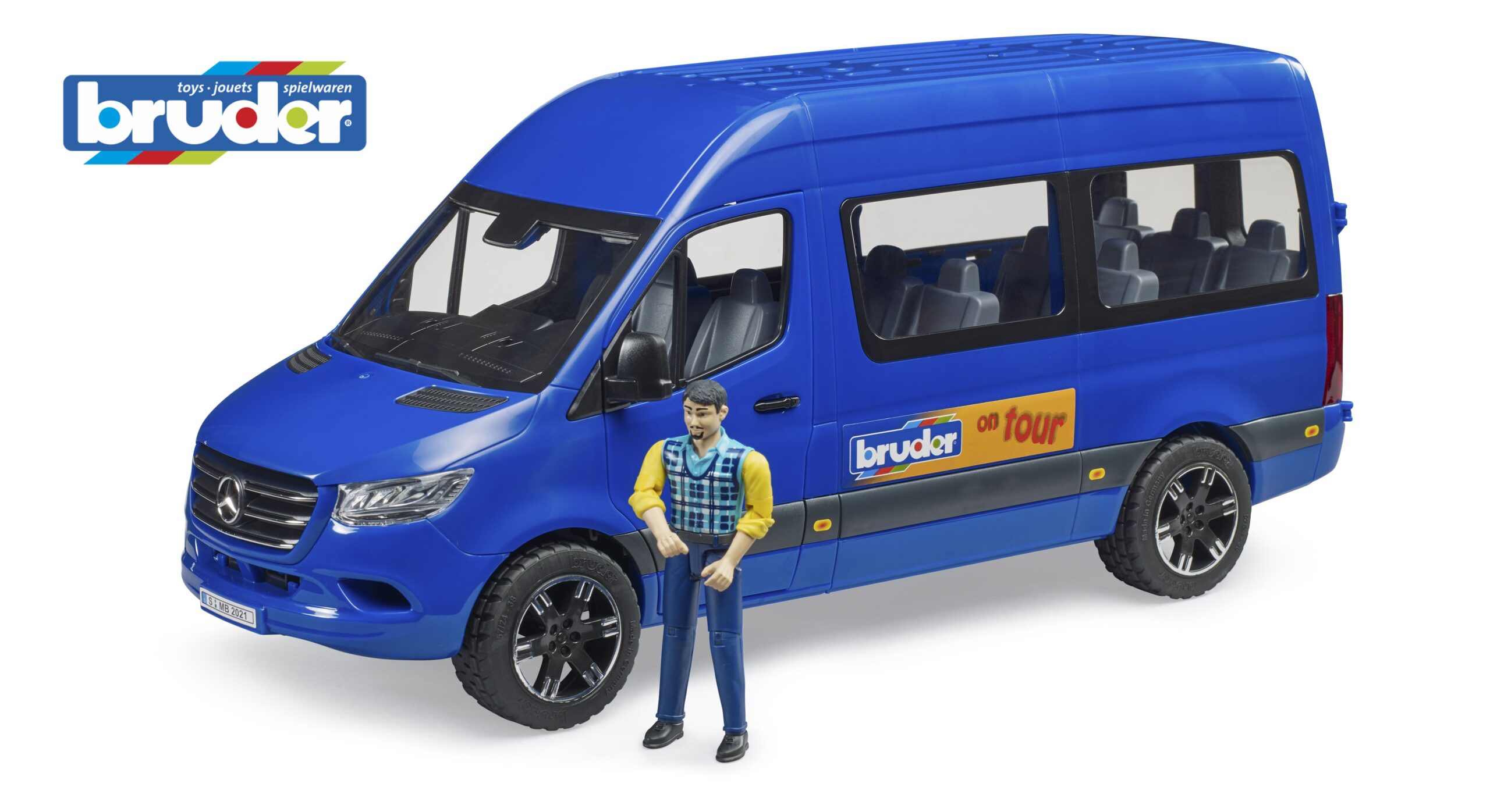 Travel in comfort and style with this realistic minibus, perfect for school runs, airport transfers, or team trips. The mb sprinter transfer bus is designed for versatility, featuring a spacious interior with modern seating for multiple bworld figures. The sliding side door clicks open smoothly to allow passengers to board, while the huge rear barn doors swing wide to reveal ample luggage space or wheelchair access. The driver’s cab is equally accessible, with opening doors for the included driver figure to take his seat. The detailed design extends to the exterior, with clear glass windows, realistic tread tyres, and authentic “Bruder on Tour” livery. This mb sprinter transfer bus offers a rich role-play experience, helping children develop social understanding and fine motor skills as they manage their own transport service.