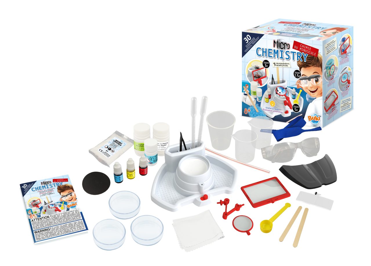 Dive deeper into the fascinating world of chemical reactions with the comprehensive Buki Micro Chemistry set. Designed for young scientists aged 8 years and older, this kit provides a wide range of equipment and safe chemical ingredients to conduct numerous experiments. Following the detailed instruction booklet, users can explore concepts like acid-base reactions, density, mixtures, solutions, and much more through hands-on activities. The kit includes essential laboratory equipment such as test tubes, beakers, pipettes, petri dishes, measuring spoons, and importantly, safety goggles.