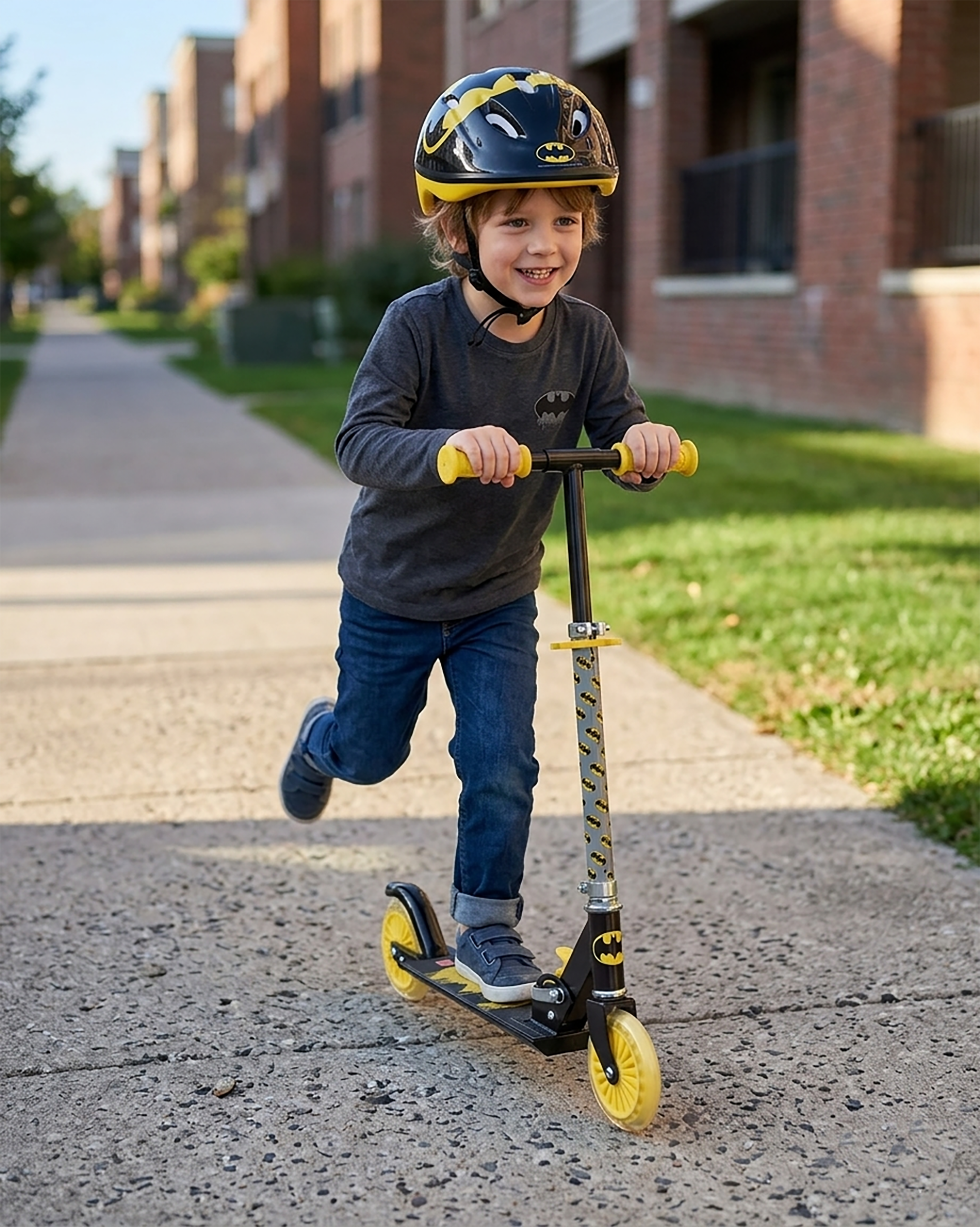 Parents will love the practical design just as much as kids love the speed. The height-adjustable handlebar means the scooter grows right alongside your child, offering years of reliable outdoor fun. When playtime is over, the clever folding mechanism allows the stem to collapse flat against the deck, making it incredibly easy to carry to the park or store away neatly at home. A simple rear foot brake brings everything to a safe and controlled stop. Encouraging physical activity and developing vital coordination skills, the batman 2-wheel scooter is the perfect gift to get children outdoors and moving with confidence.