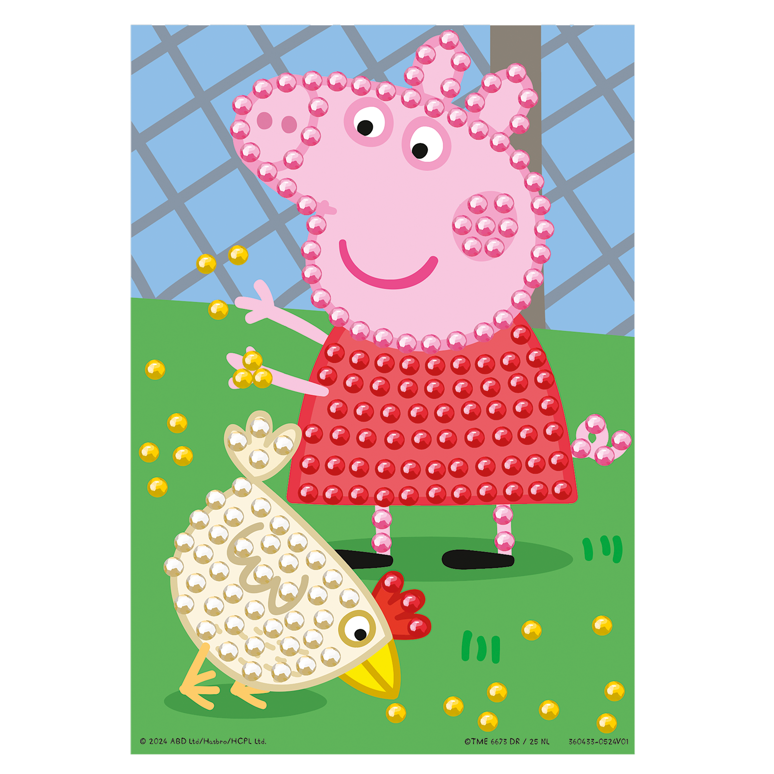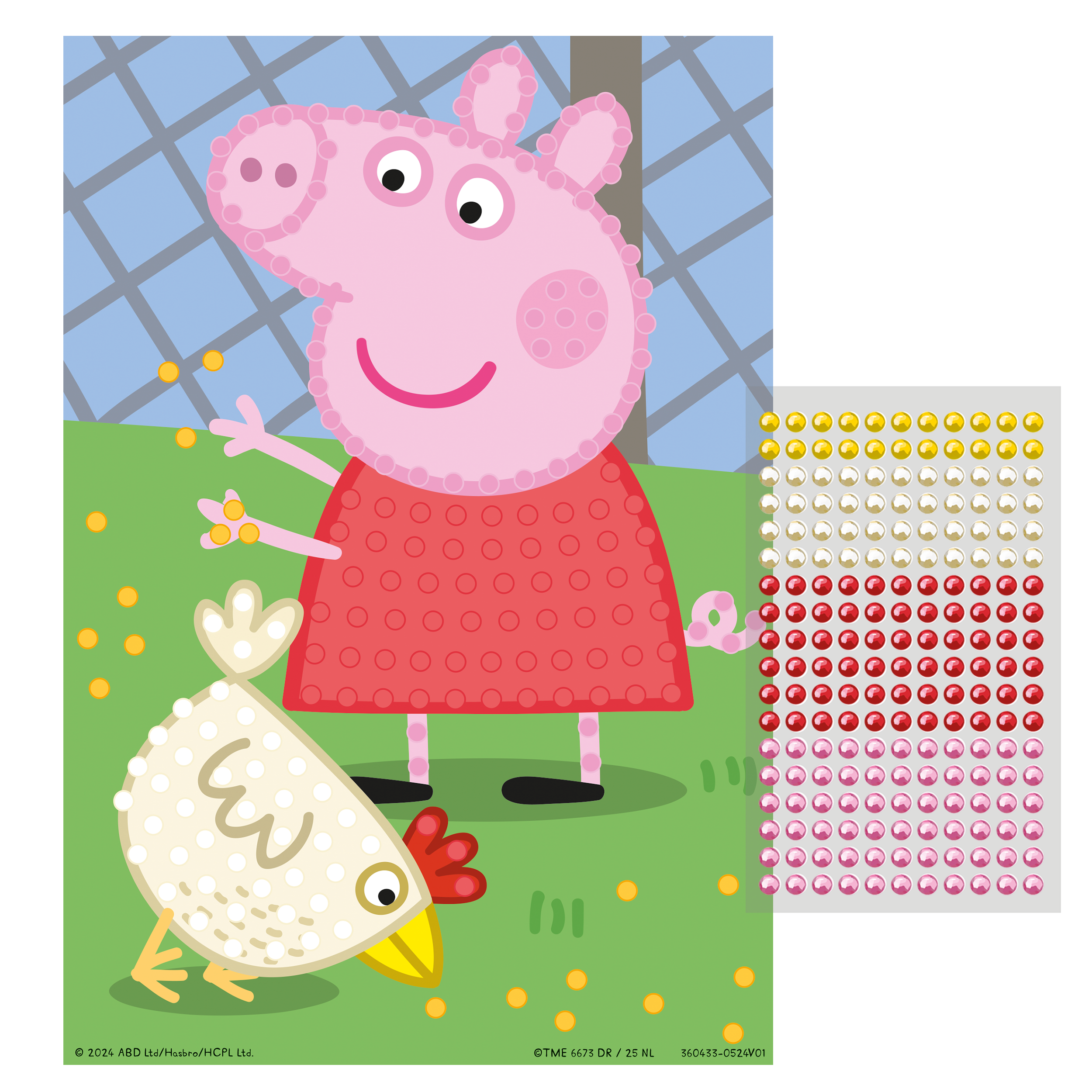 The set includes a large, self-adhesive A5 card featuring a cheerful picture of Peppa Pig with one of Granny and Grandpa Pig’s chickens. Also included are sheets of colourful, self-adhesive “beads” or gems. Simply peel the gems from the sheet and stick them onto the matching coloured dots on the card to bring the picture to life with colour and sparkle.
