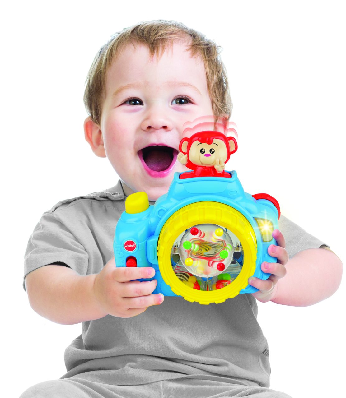 Capture playtime fun with the WinFun My First Baby Selfie Phone & Pop Up Monkey Camera twin pack! This engaging set provides double the interactive entertainment for babies and toddlers, likely suitable from 6 or 12 months onwards. The colourful Pop Up Monkey Camera features a large button that, when pressed, makes a cheerful monkey pop up, teaching cause and effect. It includes a flashing light, realistic camera sounds, and a lens element that spins or contains rattling beads for added sensory discovery.