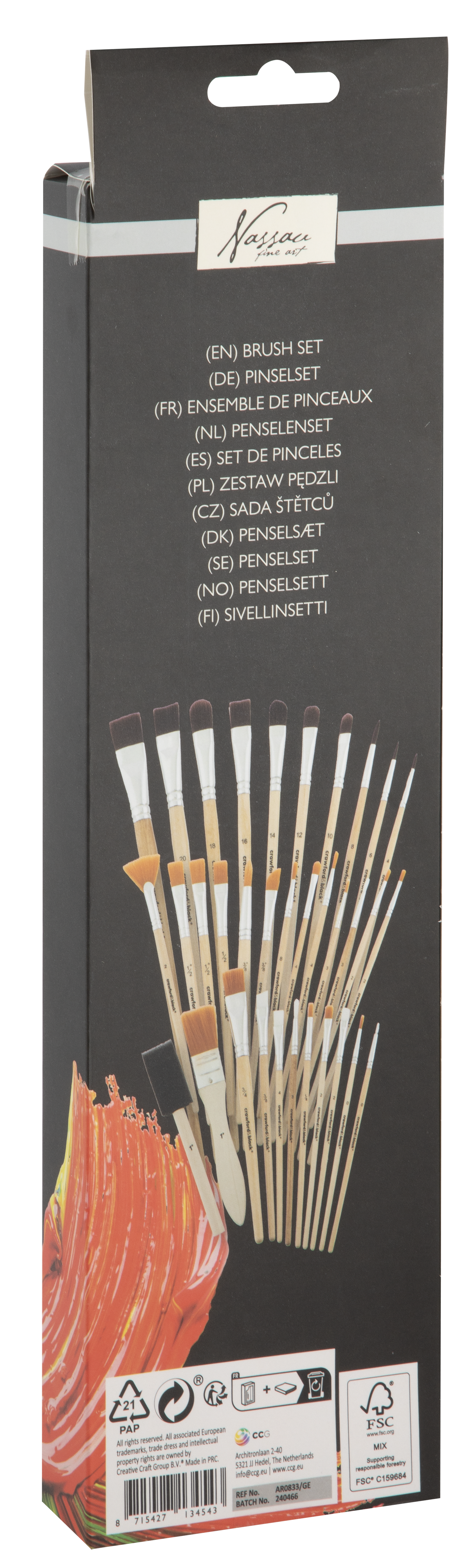 The ultimate collection for any painter, this comprehensive 35-piece Brush Set from Nassau Fine Art has every tool you could possibly need. This extensive set includes a huge variety of brush shapes and sizes, from large flat brushes for broad strokes to fine-tipped detail brushes for precision work.