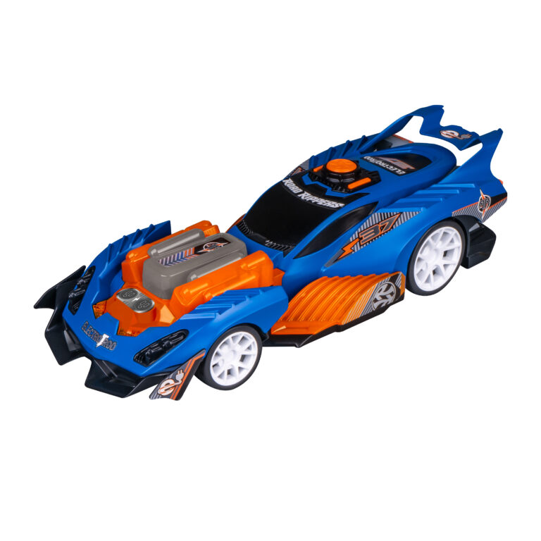 Experience futuristic racing fun with the Nikko Road Rippers Electro-Rod in striking blue! This sleek and stylish toy car, number #37, is designed for high-speed adventures and imaginative play. At the push of a button, the Electro-Rod comes to life with exciting flashing lights, cool sound effects, and energetic music, while its motorised engine propels it forward. Featuring a futuristic design with bold orange accents, exposed engine details, and racing decals, this car is ready to electrify any race. Perfect for young car enthusiasts aged 3 and up who love action-packed vehicles.