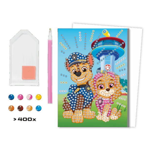 Create a dazzling, personalised greeting card featuring favourite PAW Patrol pups with this Diamond Painting Card kit. Perfect for young fans aged 4 years and older, this craft activity combines the fun of diamond painting with the joy of card making. The kit includes a pre-printed card featuring PAW Patrol characters (like Chase and Skye) with adhesive, colour-coded sections. Children use the included applicator tool, wax pad, and sorting tray to pick up the colourful plastic gems and place them onto the corresponding numbers or symbols on the card.