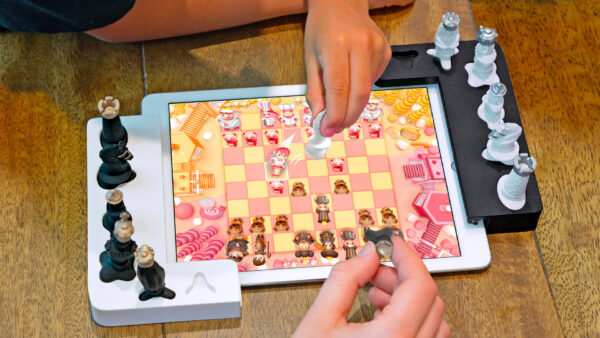 Combines physical chess figurines with digital gameplay via the Tacto app.