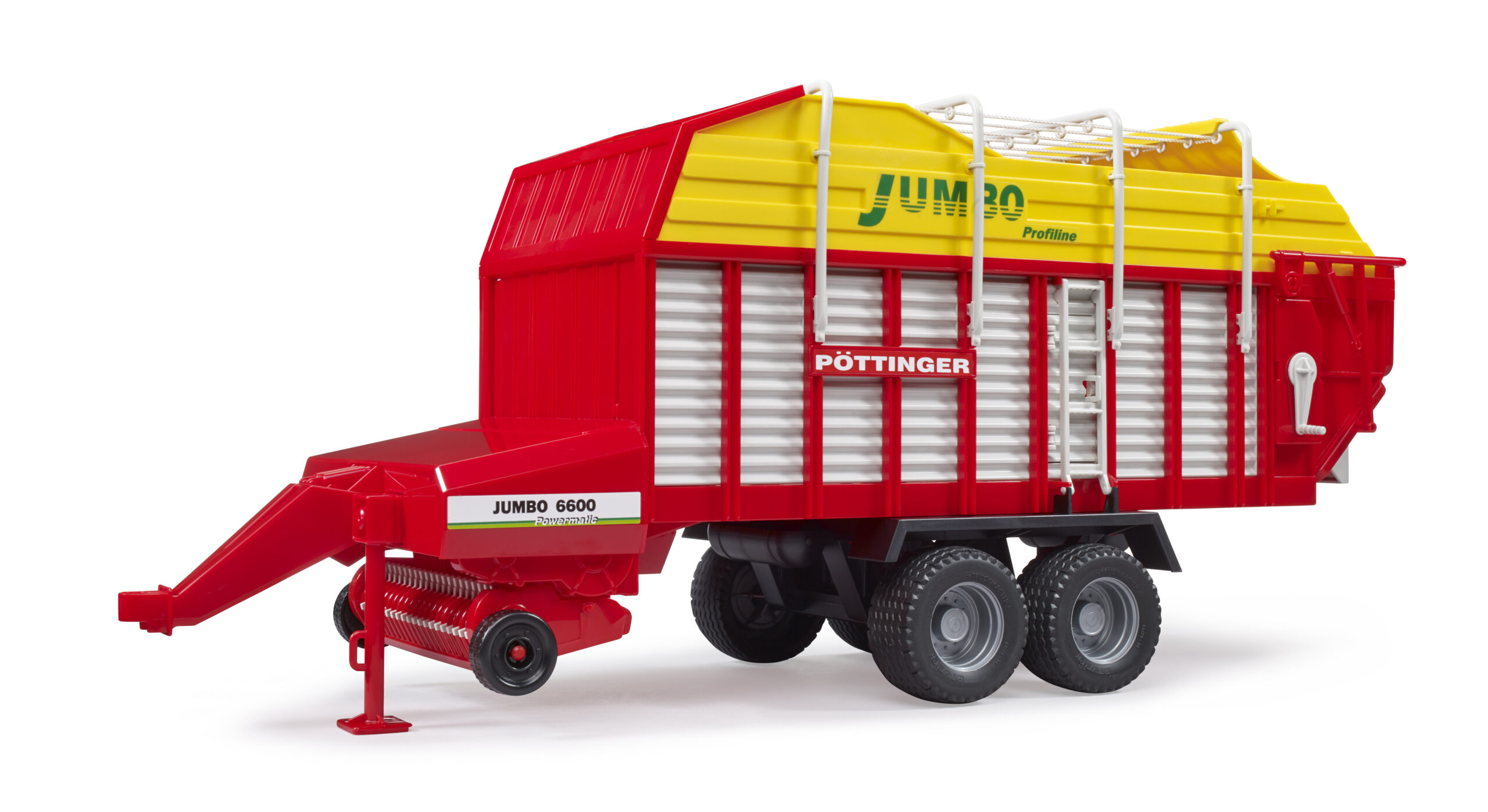Maximize efficiency during the harvest season with this high-capacity agricultural trailer. The pöttinger jumbo 6600 forage trailer is a staple on modern farms, designed to collect and transport grass, silage, or straw. It features a movable pick-up roller at the front that rotates as the vehicle moves, simulating the collection of crops from the field. For added realism, the side door opens, allowing young farmers to inspect the interior or access the load. When it is time to unload at the silage pit, the rear tailgate swings open to discharge the contents. The trailer runs on a sturdy chassis with tread tyres, ensuring it can handle the rough terrain of the garden or carpet farm. This pöttinger jumbo 6600 forage trailer is compatible with all tractors in the Bruder Professional series, making it an essential piece of equipment for any large-scale farming operation and encouraging imaginative role-play.