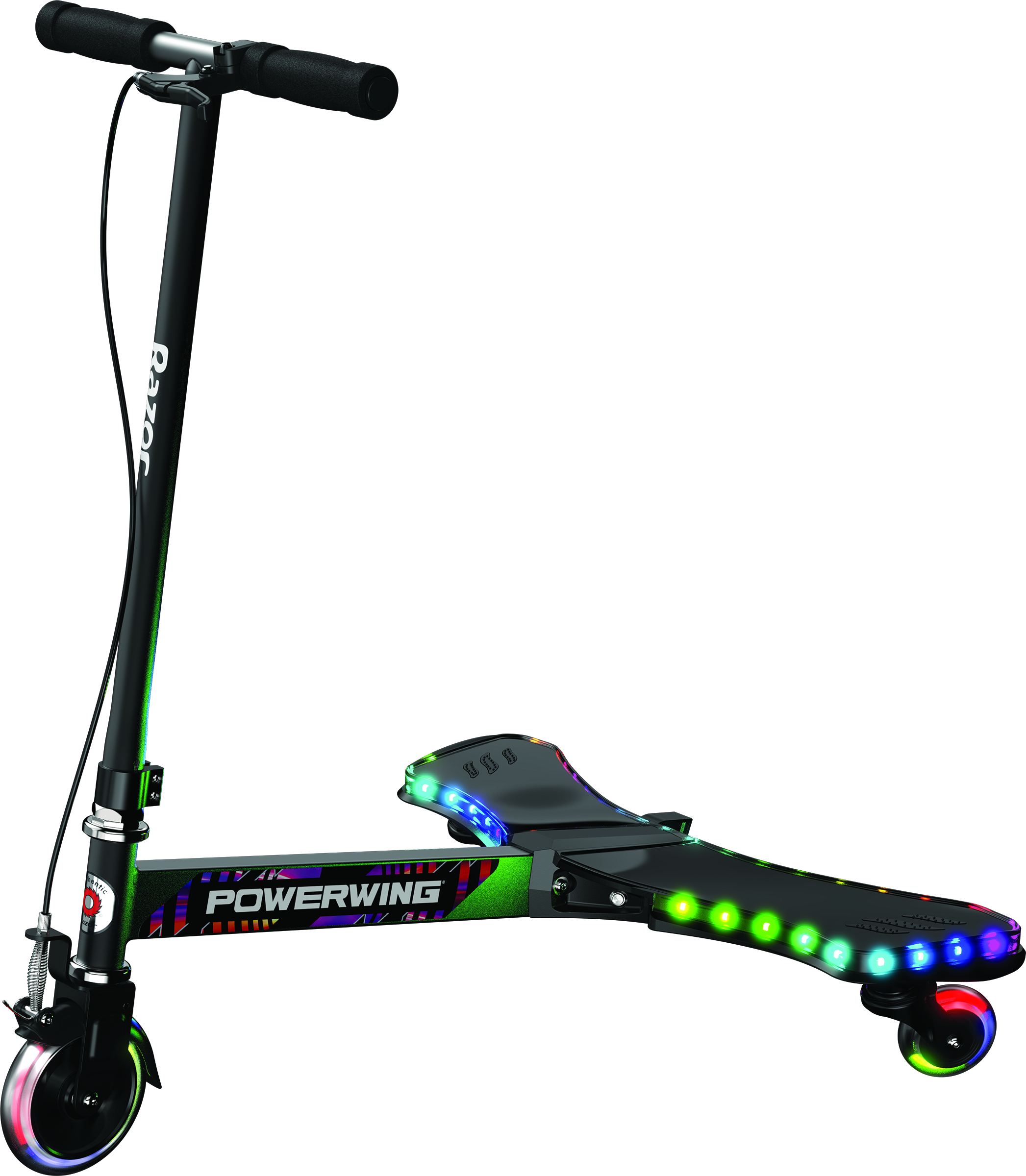 The sturdy steel main beam and polymer wings provide durability and stability, while the adjustable-height handlebar ensures a comfortable fit for growing riders. For control and safe stopping, a hand-operated front brake is included. The urethane wheels offer a smooth ride, and the dual inclined rear caster wheels are key to the Powerwing’s ability to perform drifts and 360-degree spins. When playtime is over, the Powerwing Lightshow conveniently folds for easier transport and storage. It’s a visually striking and active way for kids to enjoy outdoor fun.