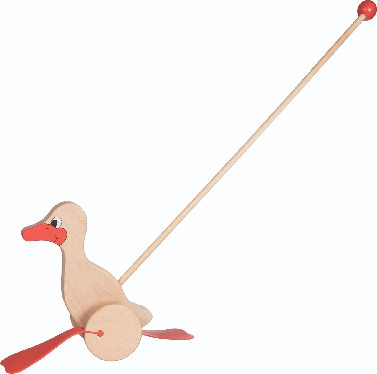 This wooden Push-along Duck, featuring vibrant colours and distinctive red beak and feet, is designed to engage toddlers in active play. Crafted from smooth, tactile wood, the duck stands 21 cm tall with a weighted base that creates a charming wobble as it moves, encouraging children to push, pull, and explore.
