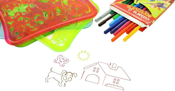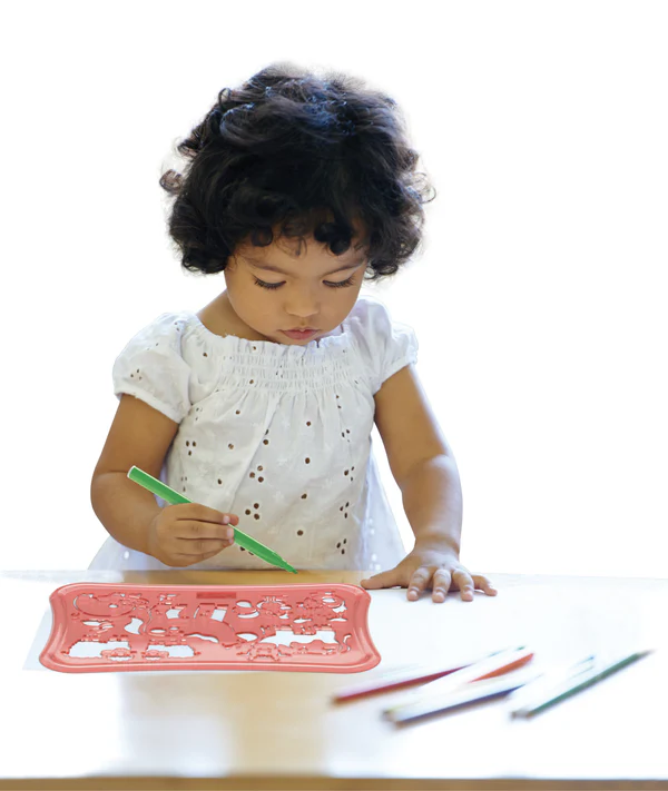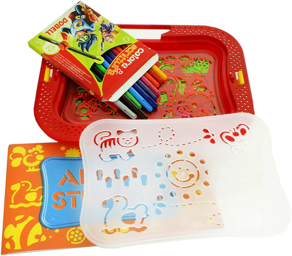 The Quercetti Stencils Design Farm Set offers a fun and creative way for children aged 3 and up to explore drawing and design. This farm-themed set includes four durable stencils featuring various farm animals, vehicles, and scenery. Young artists can easily trace the shapes and then colour them in using the 12 included markers. The set also comes with a practical holder for the stencils and markers, which includes a lid with storage space and a paper pad, making it a complete art station. This activity helps stimulate creative thinking, pattern recognition, and pre-writing skills.