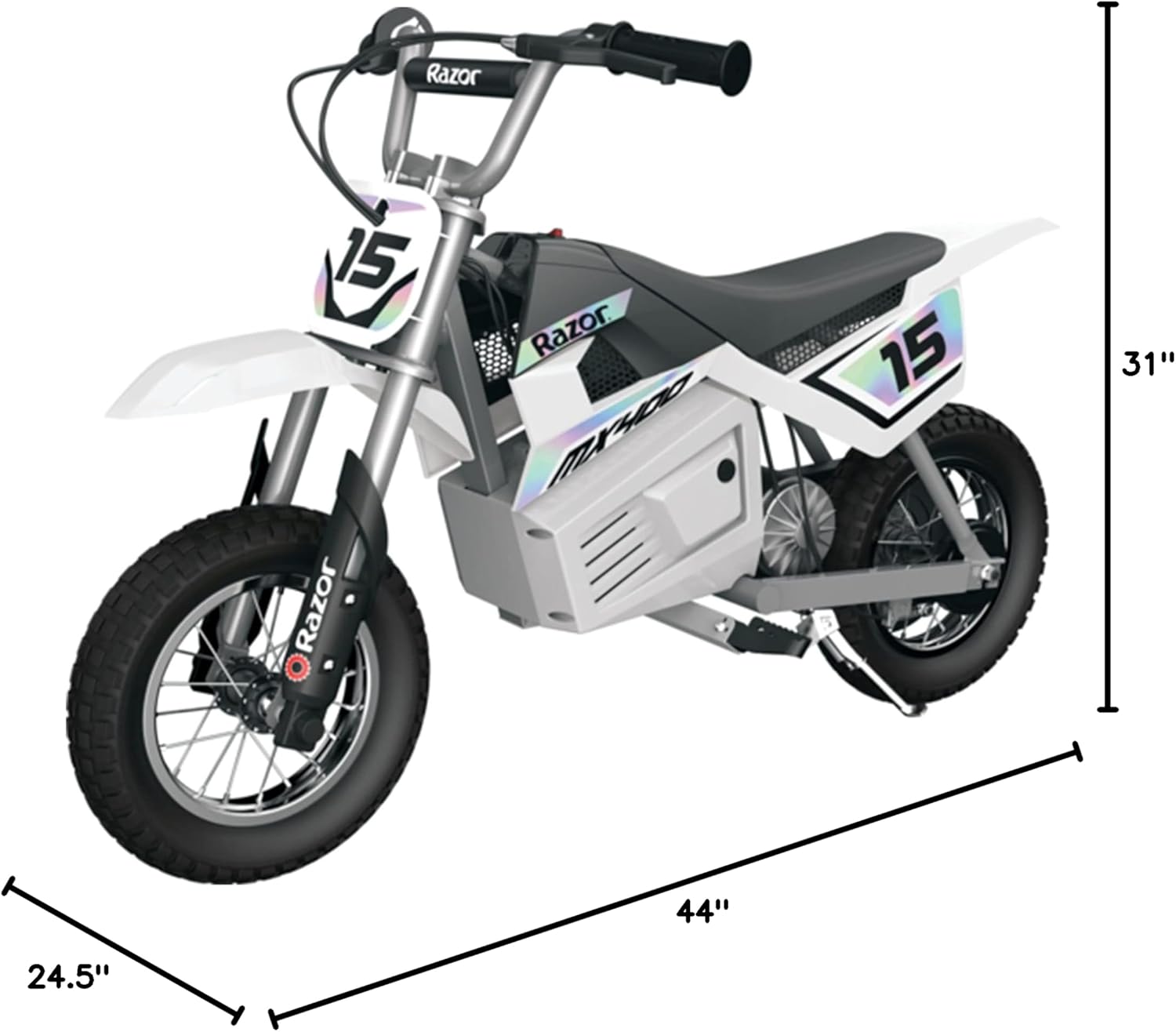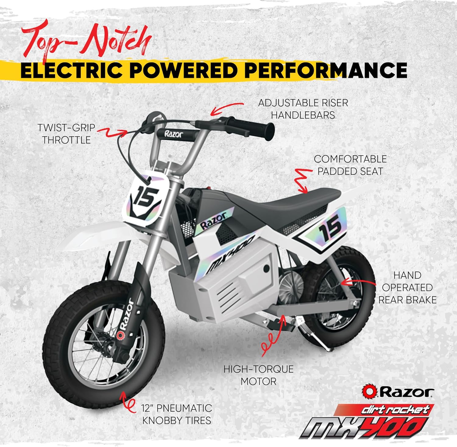 The Razor Dirt Rocket MX400 24 Volt – White is the perfect start for the next generation of motocross riders looking to elevate their off-road adventures. This impressive machine combines top-notch, electric-powered performance with a true-to-life motocross design, scaled down for riders aged 13 and up. It delivers an authentic dirt bike experience, allowing young riders to tackle trails and bumps with confidence. The Razor Dirt Rocket MX400 24 Volt – White features a high-torque motor for powerful acceleration and knobby pneumatic tyres designed for maximum power transfer on uneven surfaces. Get ready to tear up the track and experience the thrill of the ride!