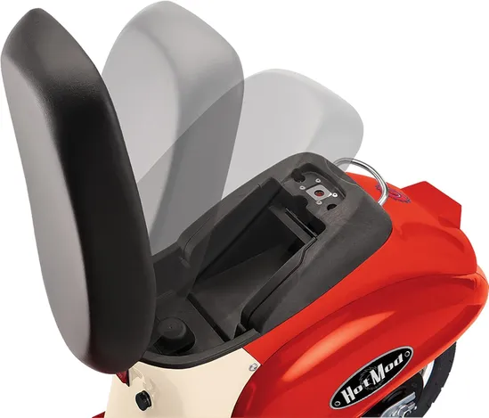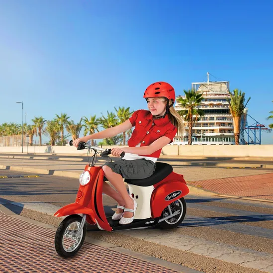 Cruise in classic style with the Razor Pocket Mod Hot Mod miniature electric scooter in a vibrant red. This vintage-inspired ride is perfect for young trendsetters aged 13 and up who appreciate a retro aesthetic. The Hot Mod offers up to 40 minutes of continuous ride time on a single charge, reaching speeds of up to 15 mph (24 km/h) thanks to its powerful 24-volt rechargeable battery system and chain-driven motor. It features a comfortably padded seat, large 12-inch pneumatic tyres for a smooth ride, and a handy secret storage compartment under the seat. With its timeless design and fun performance, the Razor Pocket Mod Hot Mod is pure bliss on wheels.