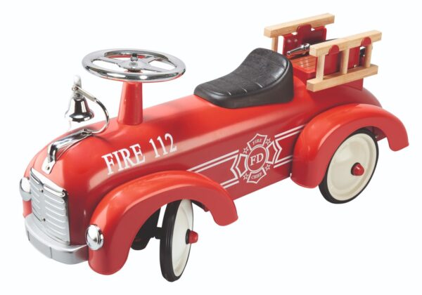 Race to the rescue with the Goki Classic Ride-on Fire Engine. This wonderful vintage-style ride-on is made from sturdy metal and is packed with charming details. Little firefighters can alert everyone to the emergency by ringing the working chrome bell, steer to the scene with the chunky steering wheel, and unroll the fire hose from the back. The two wooden ladders are also removable for more realistic play. With its durable metal body and smooth-rolling wheels, this ride-on fire engine is perfect for encouraging years of active and imaginative play.