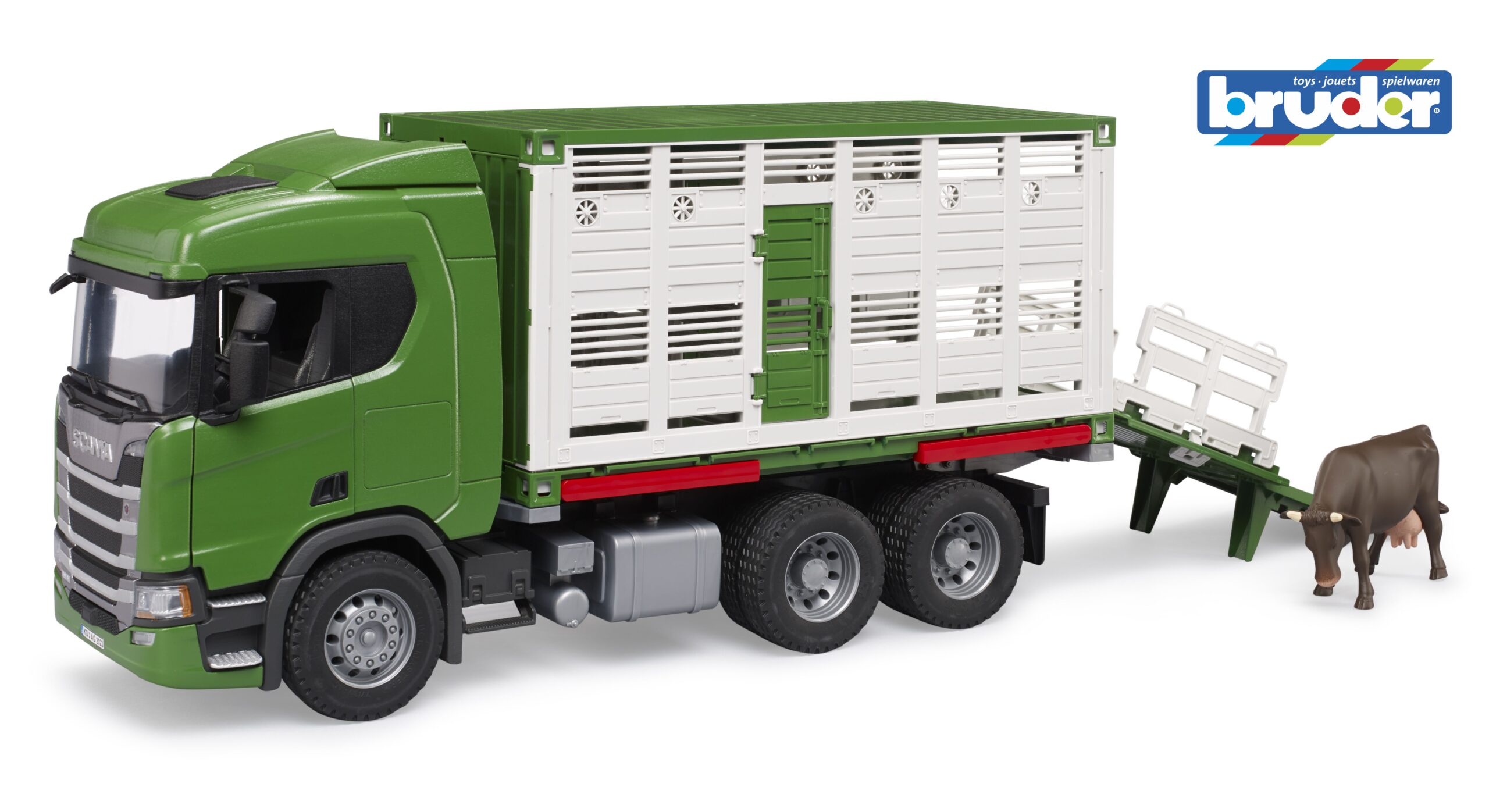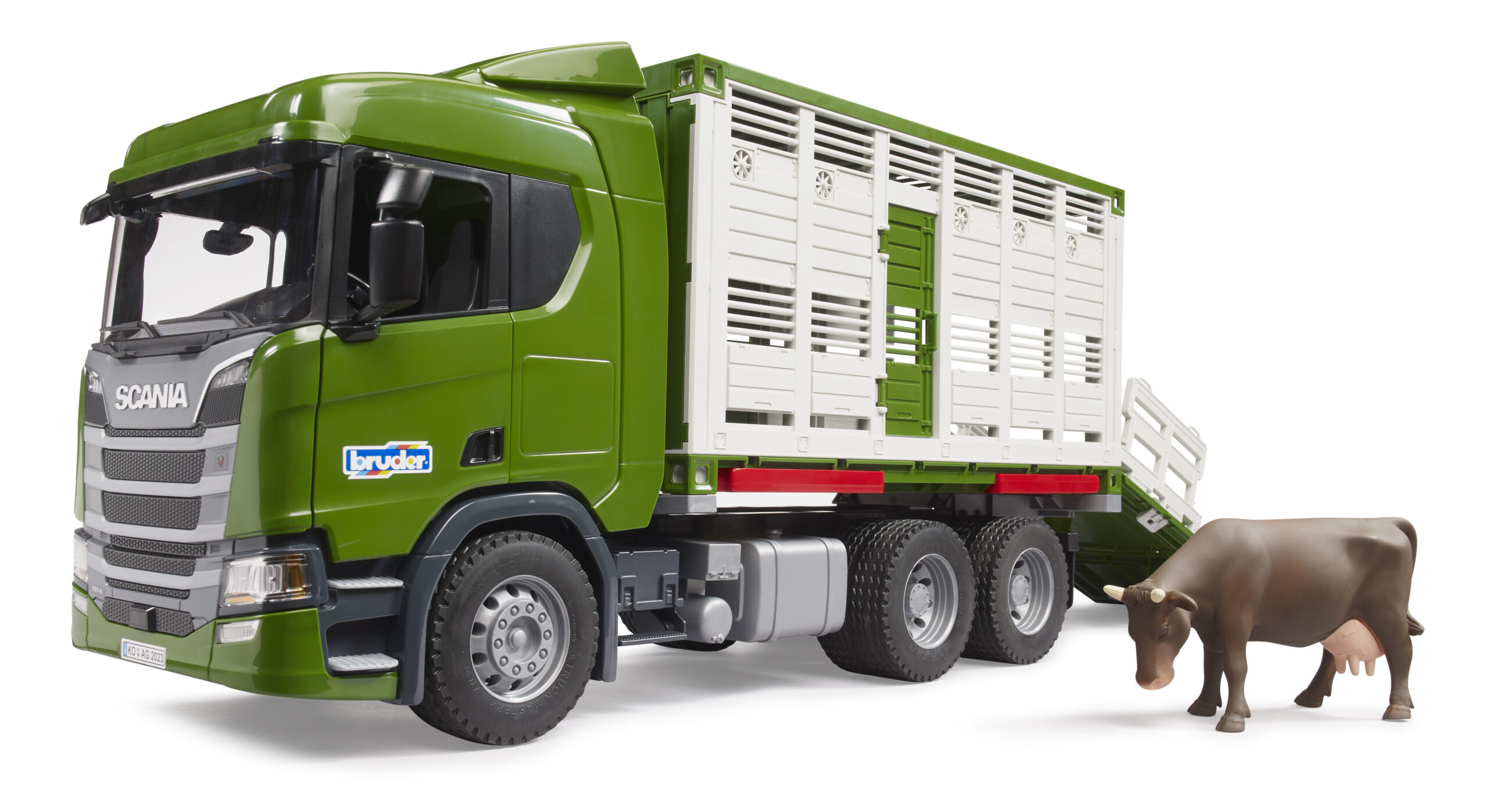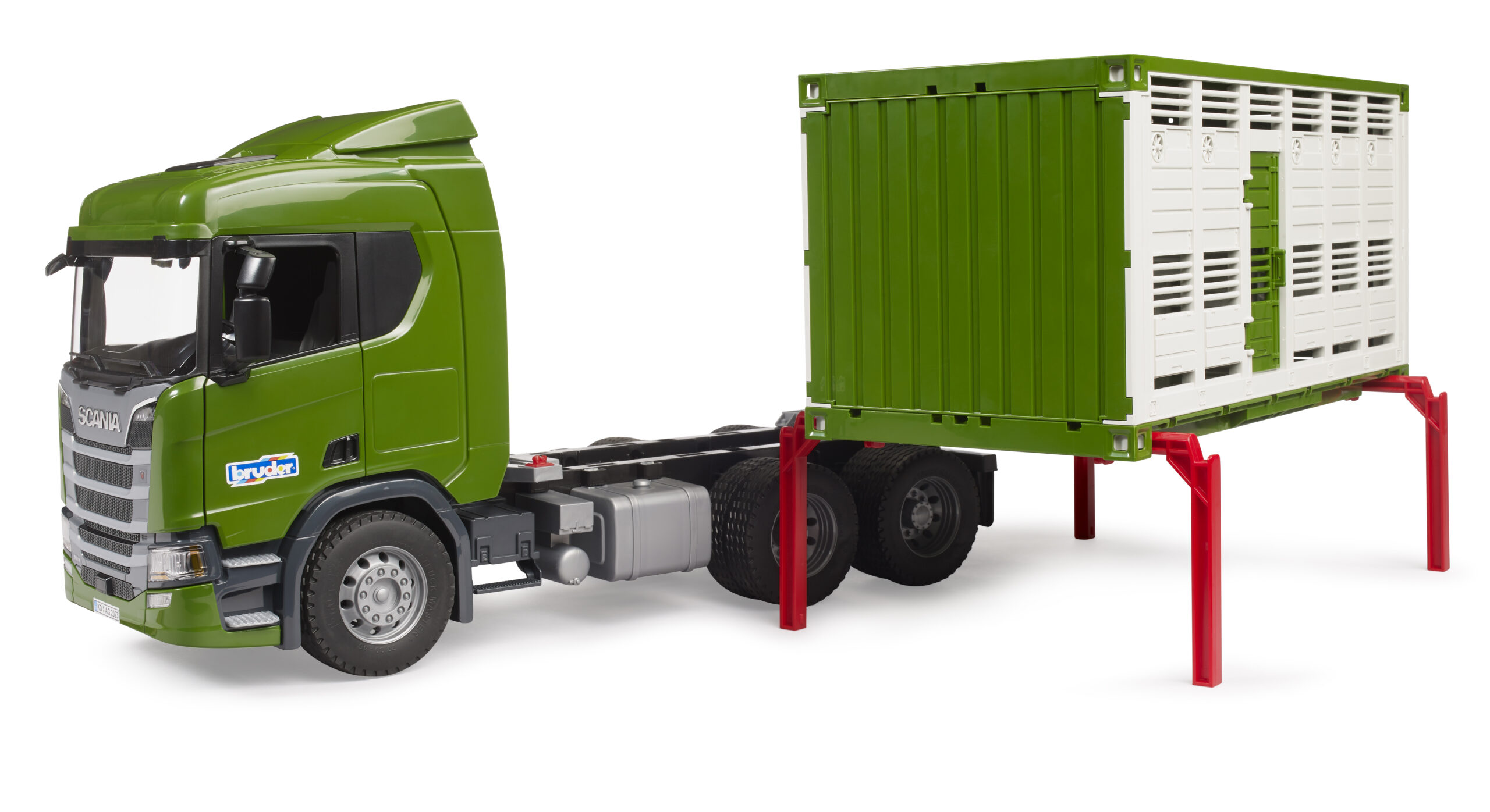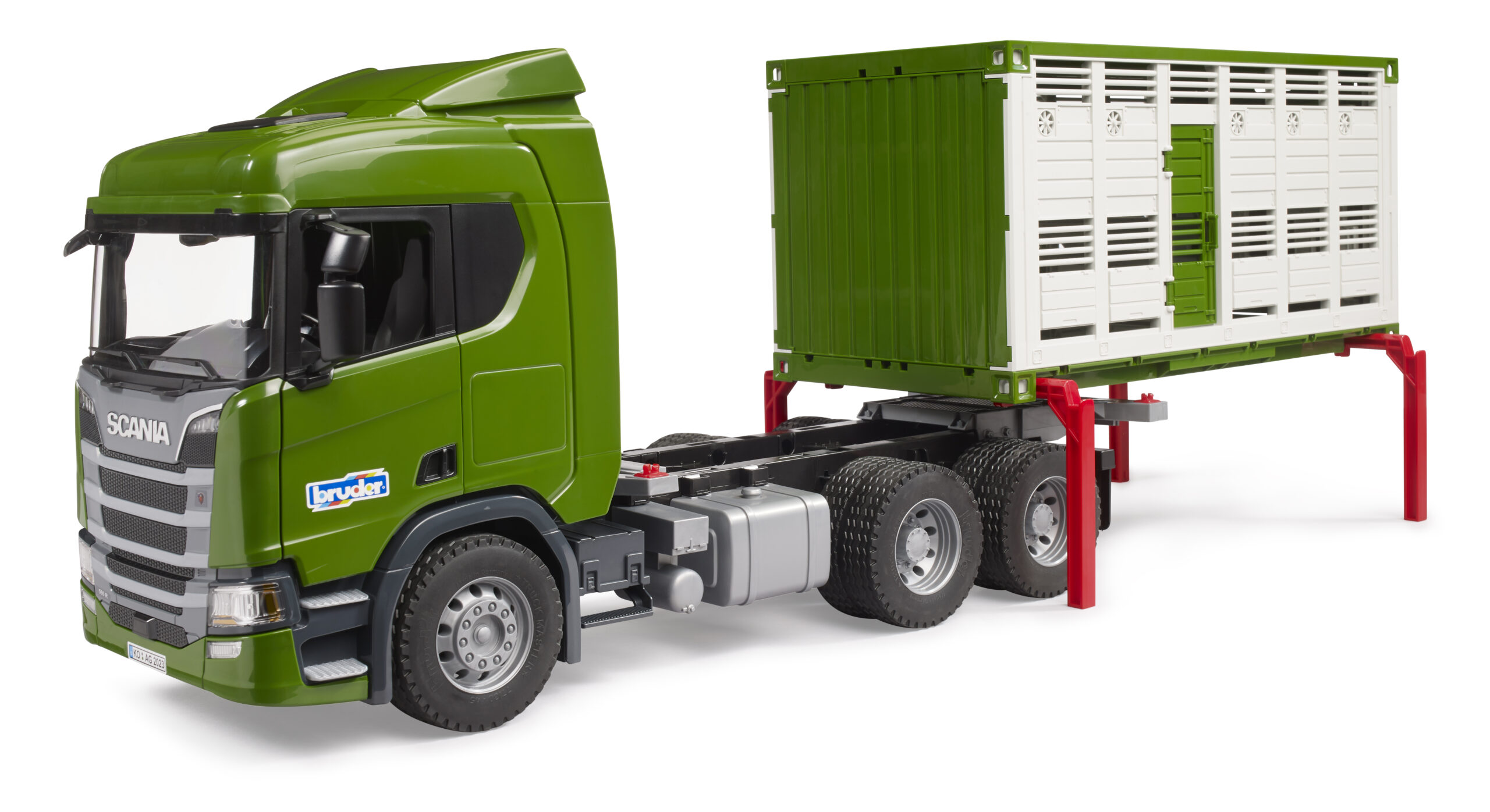 The container body can be removed from the chassis and stood on fold-out support legs, allowing the truck to be used for other tasks if compatible beds are swapped. The driver’s cab is equally detailed, with folding mirrors and opening doors ready for a driver figure to take the wheel. Built for resilience, this scania cattle transport truck includes one cow figure to start the farming adventures immediately, encouraging imaginative role-play and fine motor skill development.
