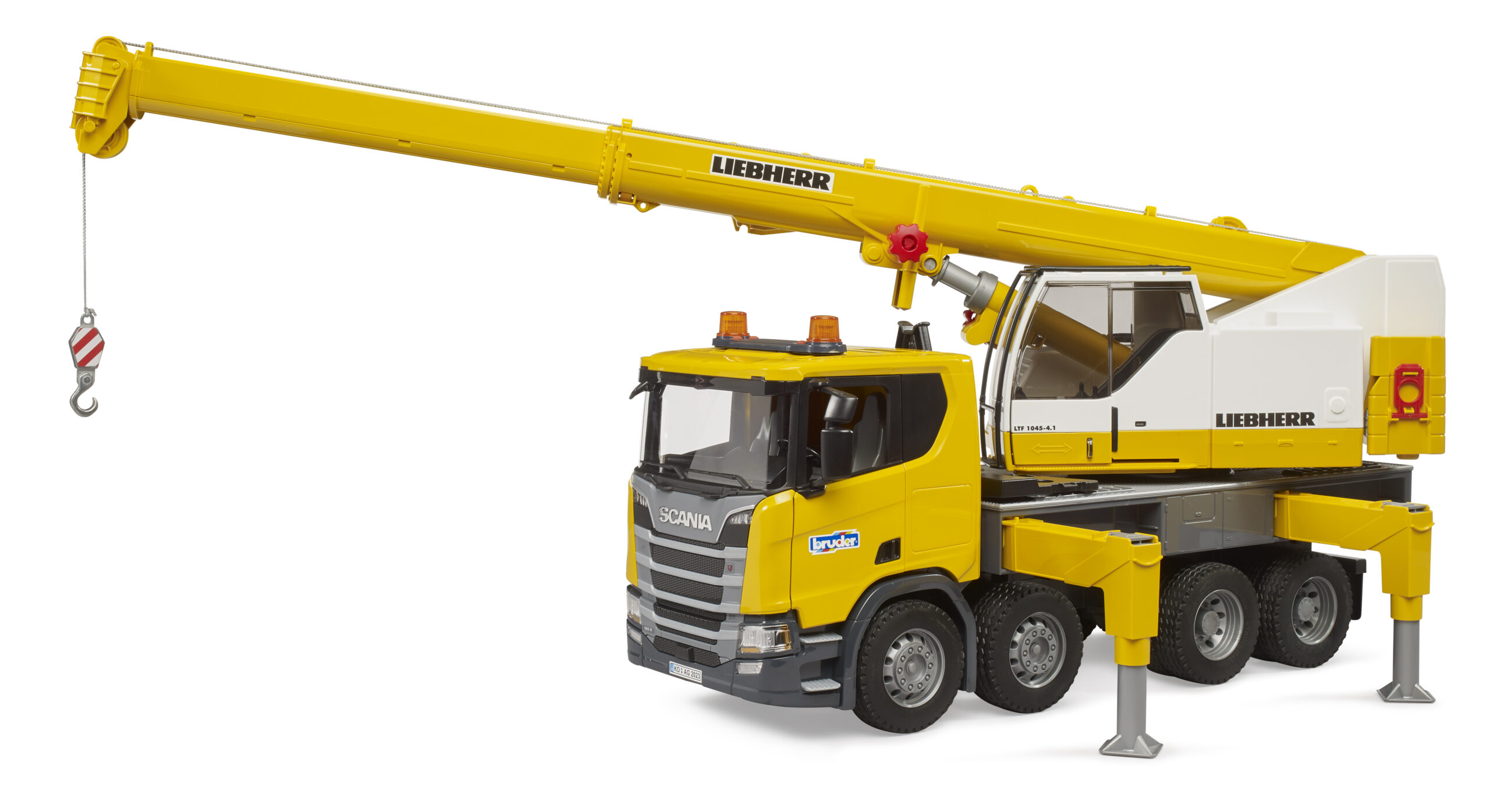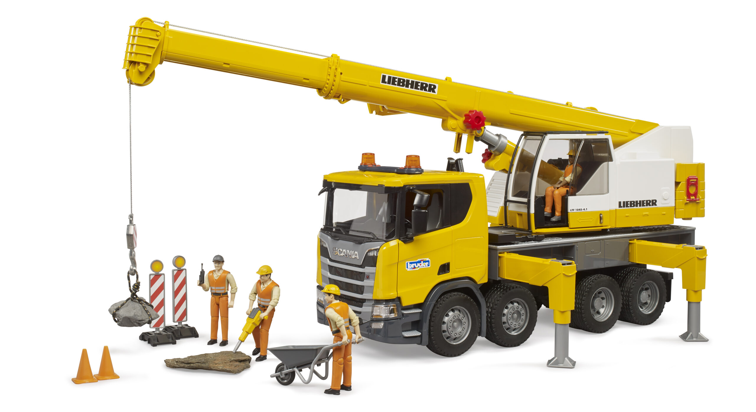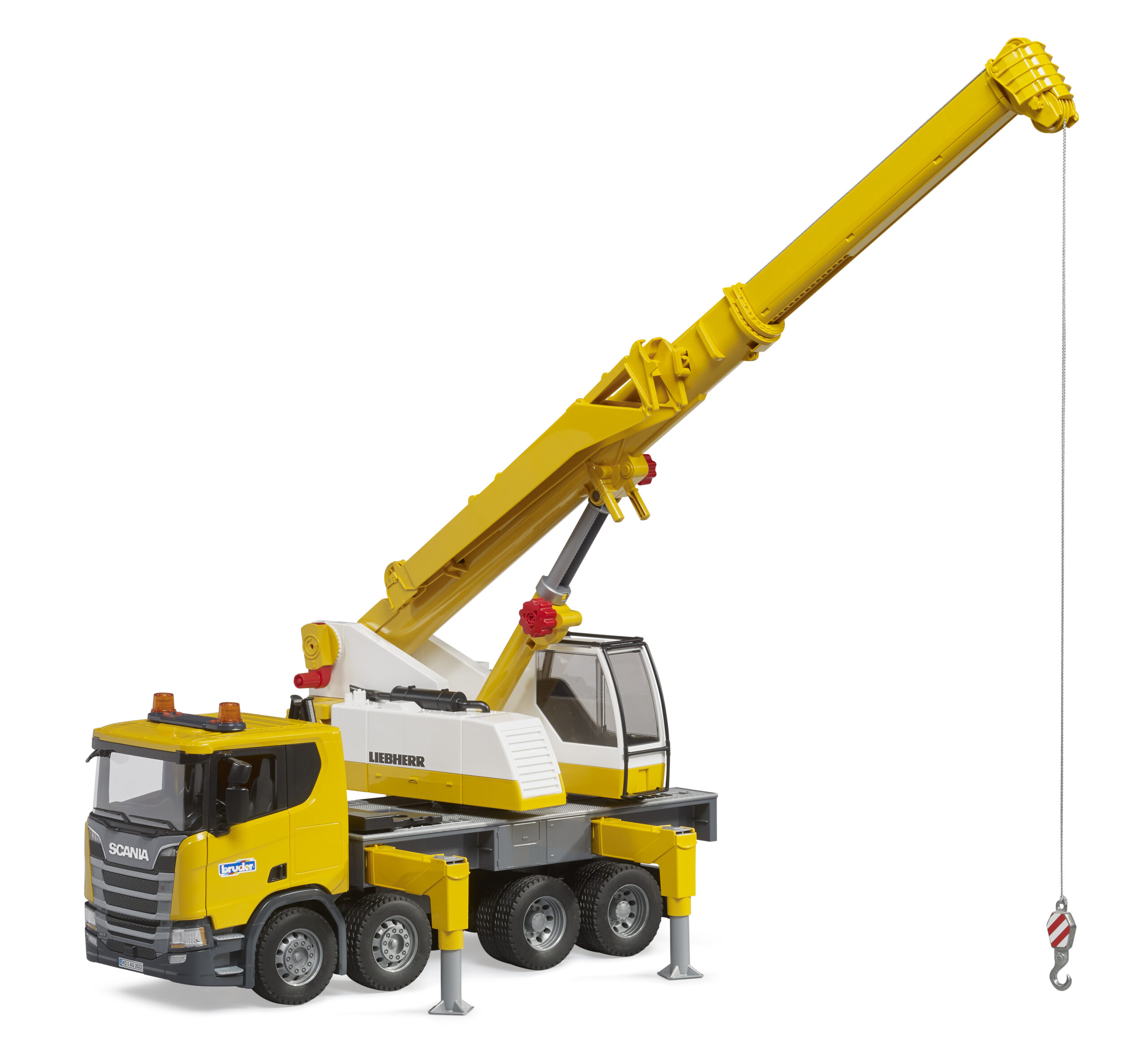 Young construction managers can tackle the biggest lifting jobs with this massive yellow machine. The scania liebherr crane truck stands at an impressive height of 1.3 metres when the telescopic boom is fully extended with the additional attachment. Aspiring operators can control the functional cable winch to hoist loads with precision, while the crane structure rotates 360 degrees to place materials exactly where they are needed on the site.