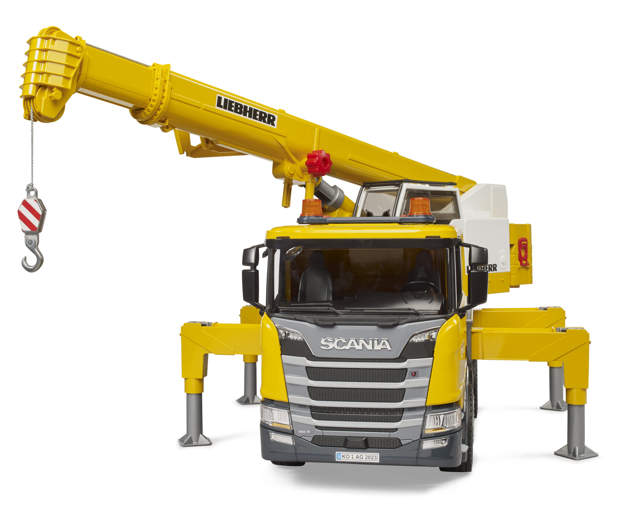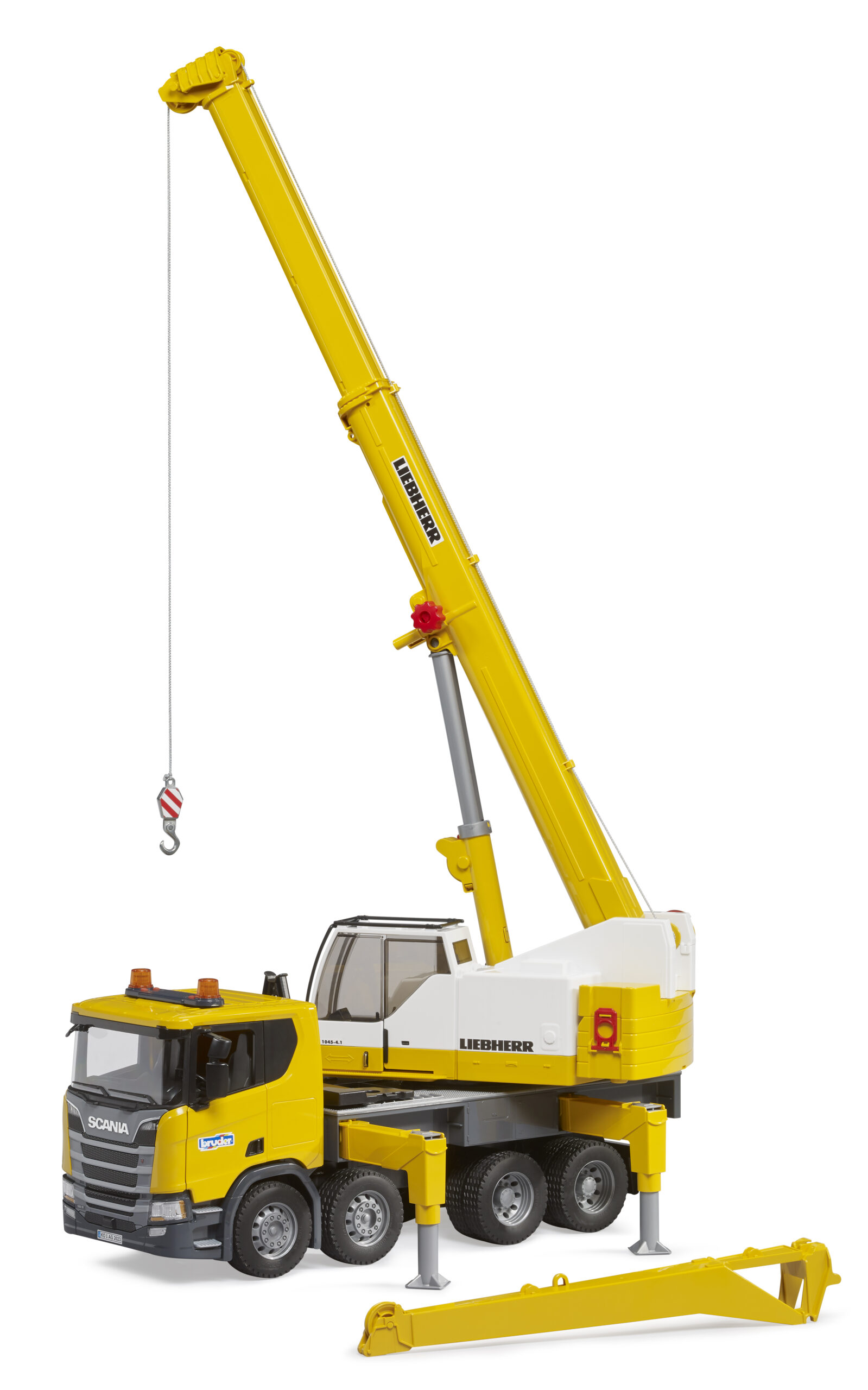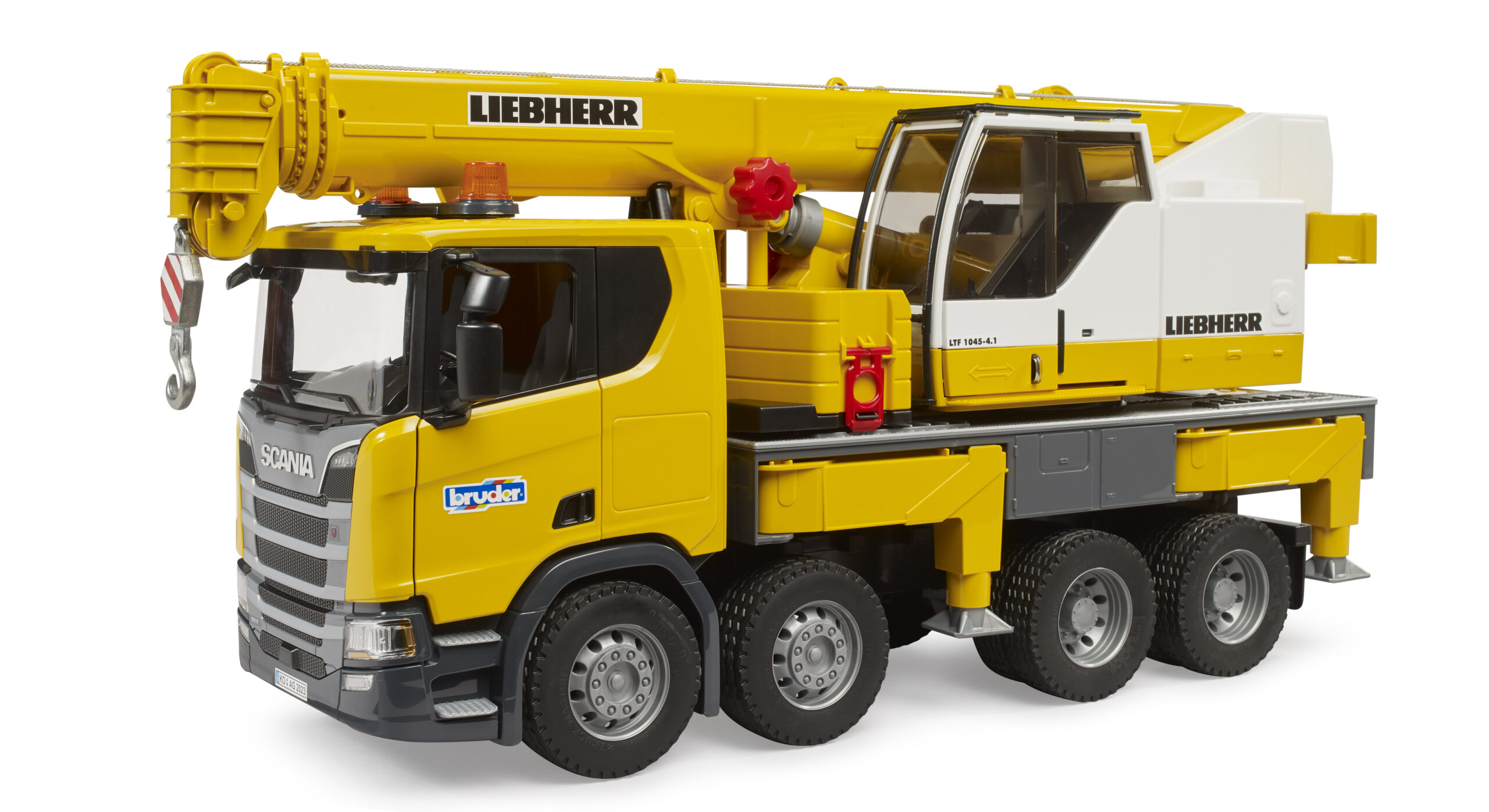 Young construction managers can tackle the biggest lifting jobs with this massive yellow machine. The scania liebherr crane truck stands at an impressive height of 1.3 metres when the telescopic boom is fully extended with the additional attachment. Aspiring operators can control the functional cable winch to hoist loads with precision, while the crane structure rotates 360 degrees to place materials exactly where they are needed on the site.