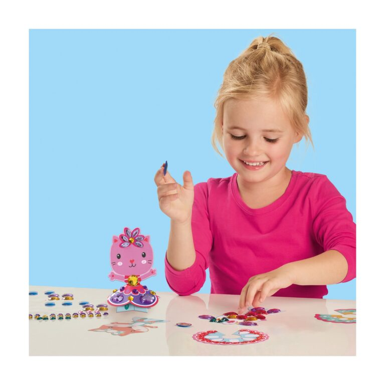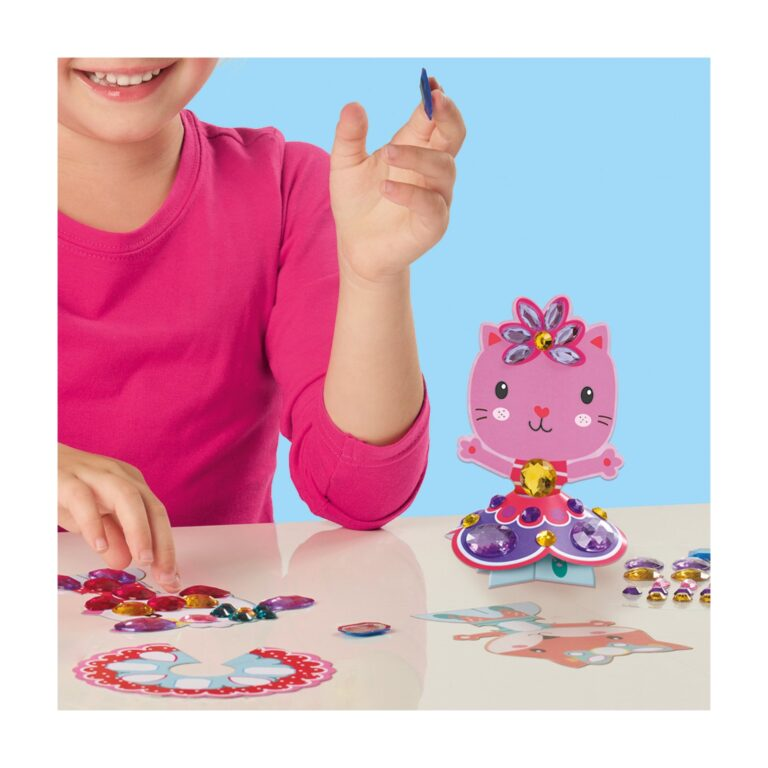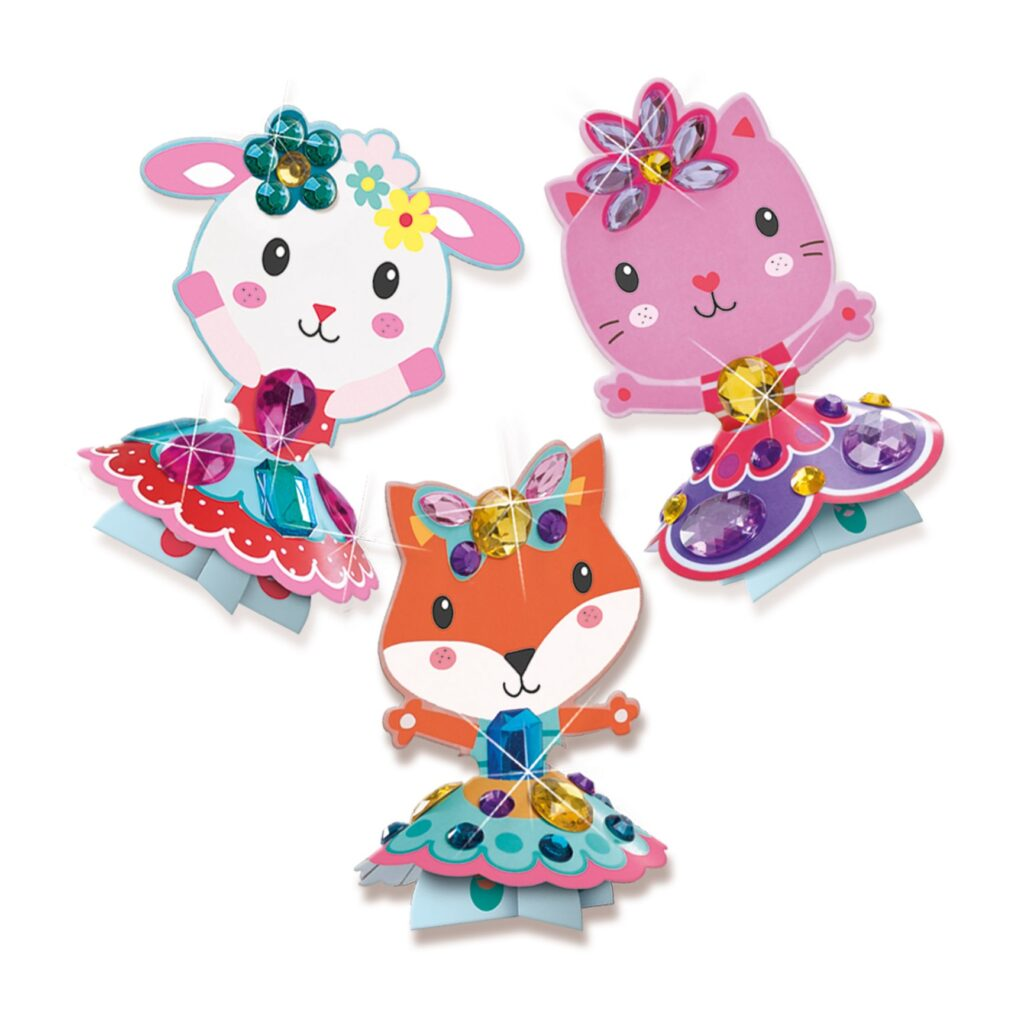 The set includes all the pre-cut paper parts needed to build a cat, a sheep, and a fox. The real fun is in the decoration. Use the 65 large, self-adhesive “diamond” gems to give your dancers beautiful, sparkling skirts and accessories. Once complete, the special design of the figures allows them to spin and twirl on any flat surface.