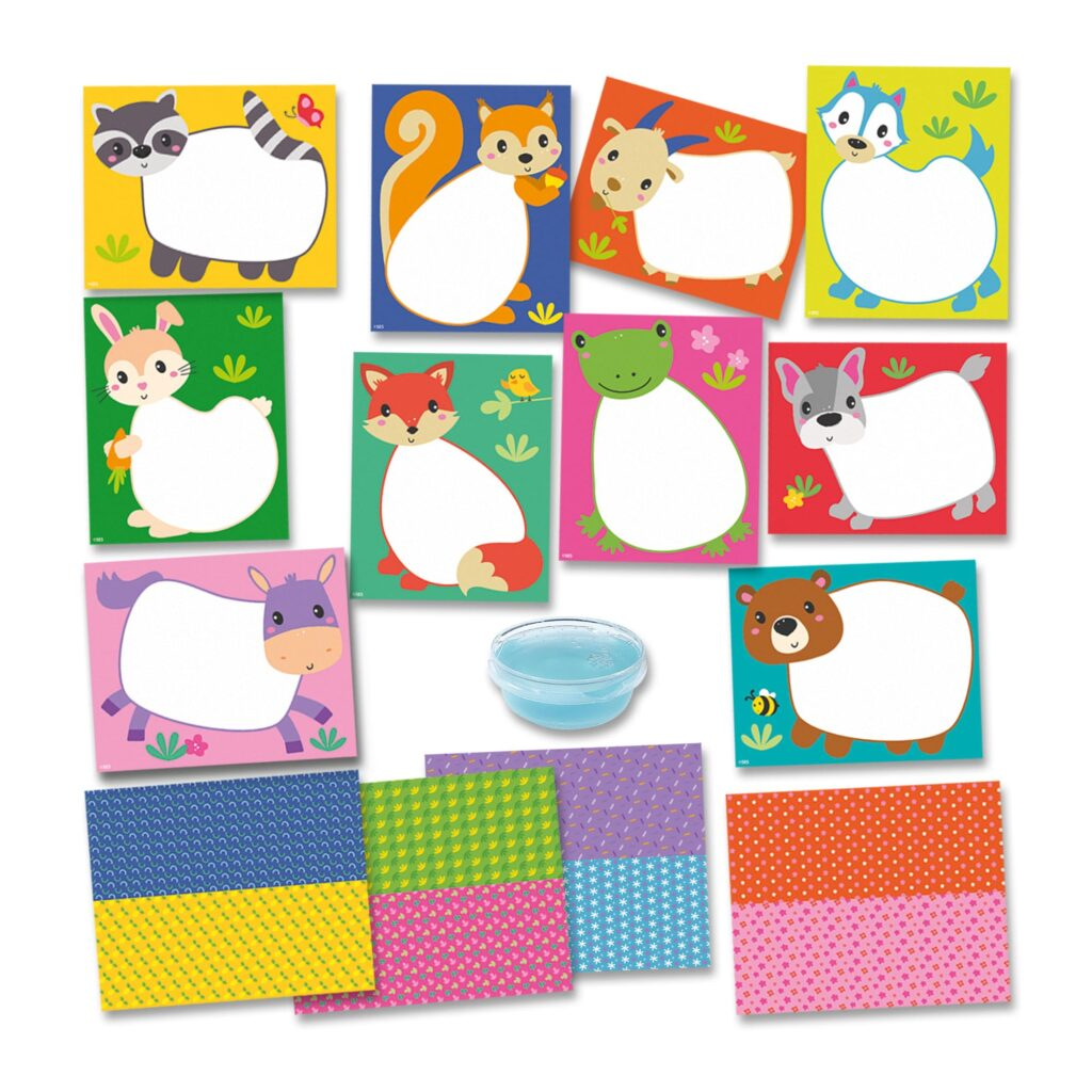 The set includes ten large animal cards to decorate and four sheets of colourful, patterned paper. Children can have fun tearing the paper into smaller pieces and then using the special, safe finger glue to stick them onto the cards. No brush is needed; the glue can be applied directly with a finger, adding to the tactile, sensory experience.