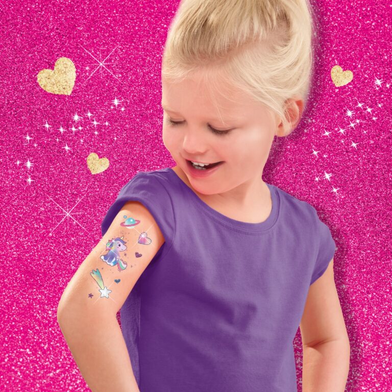 The set includes a sheet with over 64 colourful unicorn and star-themed temporary tattoos. They are easy to apply and look great on their own. To add some extra glamour, use the included skin-friendly glue and two colours of cosmetic glitter to make your tattoos shine and sparkle. All the contents are safe, cosmetically tested, and easy to remove.